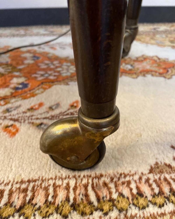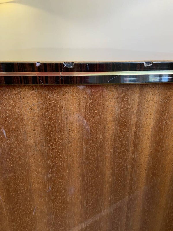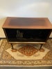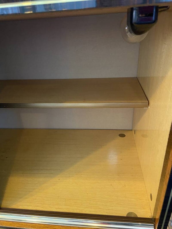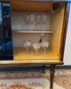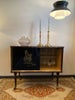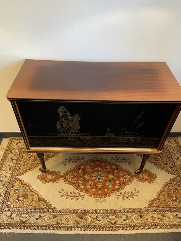 Quelle belle armoire à liqueur! Rechtstreeks uit la douce France: een drankenkastje uit de jaren ’60. Uitgevoerd in glanzend mahonie fineer met zwarte, glazen schuifdeuren waarop goudkleurige decoraties zijn aangebracht van zwanen, riet en struiken. Het kastje is aan de binnenkant uitgevoerd in essenfineer en heeft een extra plank en verlichting. De kast heeft rondom messingdetails en staat stevig op de originele wieltjes. Gebruikssporen zijn zeker aanwezig, maar het kastje is daardoor niet minder charmant! Goed om te weten: het bovenblad is verkleurd; vermoedelijk heeft hier een tv op gestaan, de sierband rechtsboven heeft beschadigingen en links onderin is een opening in de achterkant gemaakt. Deze opening zie je alleen als je geknield voor het kastje zit. Zie hiervoor ook de foto's.