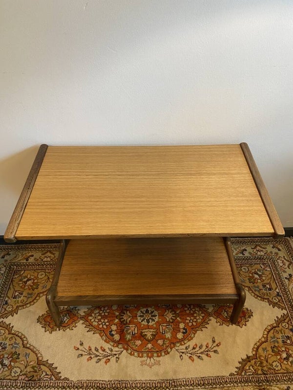 Het iconische tv-meubel van Louis van Teeffelen, uitgevoerd in licht eiken fineer! De tafel kan natuurlijk gebruikt worden om je tv op te zetten, maar doet het ook goed als bijzettafel of plantentafel! De tafel heeft gebruikssporen, zoals te zien is op de foto's. Het bovenblad is iets lichter van kleur dan het onderblad en heeft wat beschadigingen aan de rand; niet storend maar goed om te vermelden. Rechtsonder bij het frame zit een scheurtje in het hout. Dit vermindert de stabiliteit van de tafel niet en zou opgevuld kunnen worden met kneedbaar hout o.i.d. Hiermee is rekening gehouden bij de prijsbepaling.