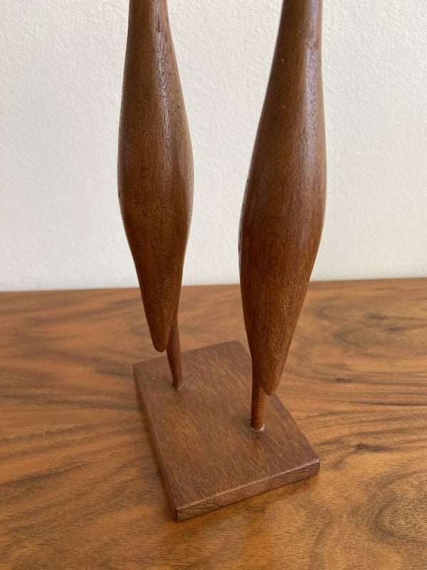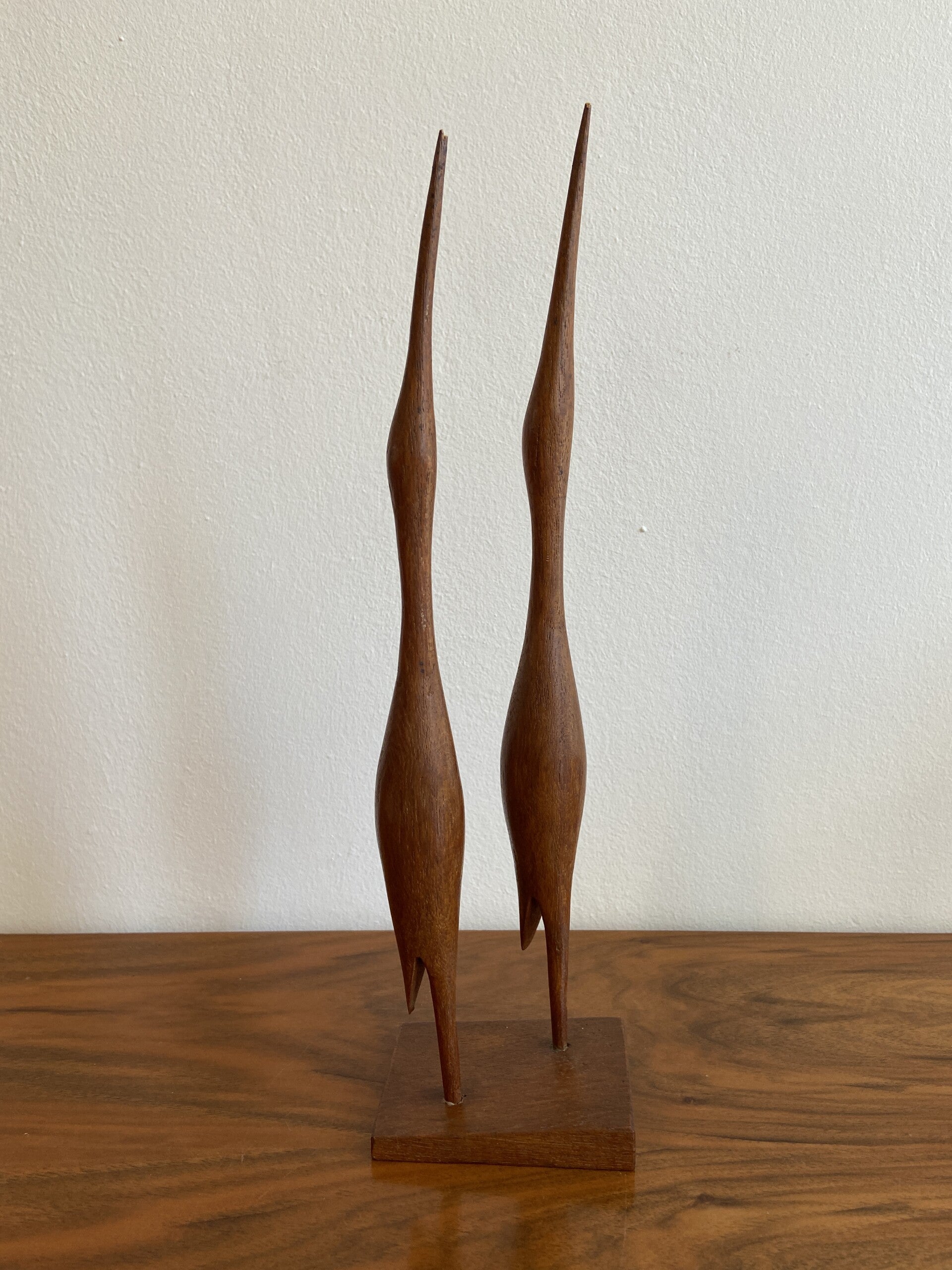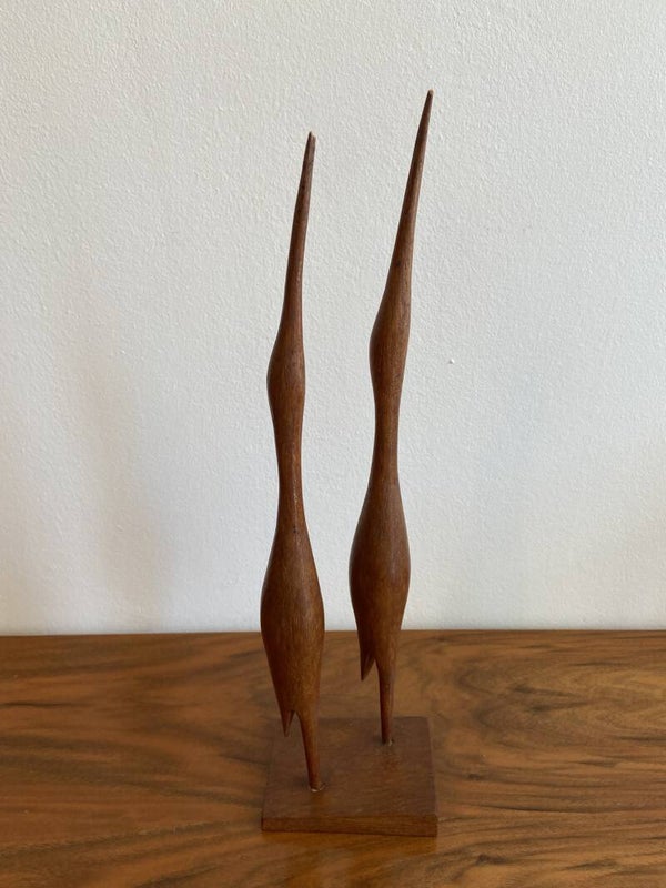 Decoratief object van twee vogels van teakhout, gemaakt in de jaren '50-'60. De vogels verkeren in een mooie vintage staat; geen scheuren e.d.