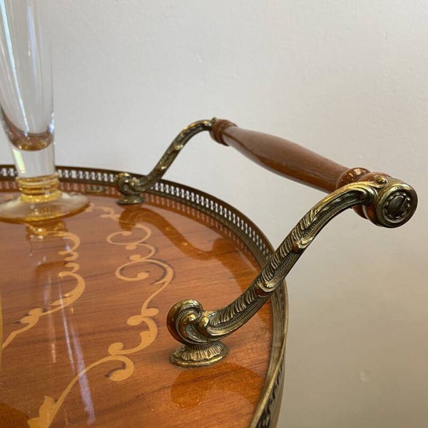 Bijzondere Italiaanse vintage bar cart /serveerwagen uit de jaren '50/'60! De bar cart is uitgevoerd met 2 vaste serveerbladen die omrand zijn met bewerkt koper. De serveerbladen zijn gemaakt van kunstig ingelegd fineer (zgn. marqueterie). De bar cart heeft een frame van sierlijk gevormd hout en staat stevig op wielen die nog soepel rollen. Let op de rijk vormgegeven details bij het handvat, het frame en de wielen.