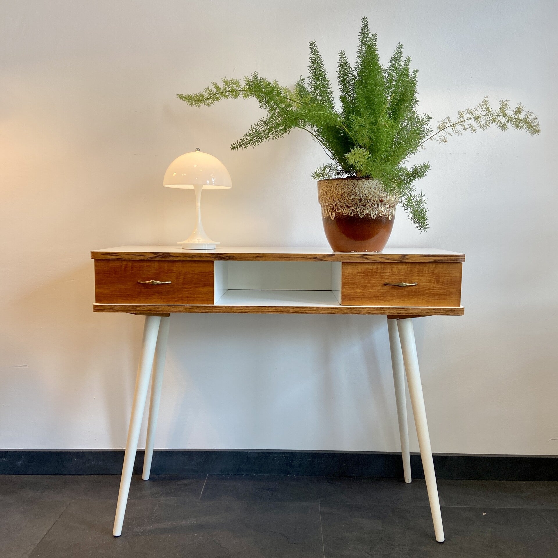 Een superlief kaptafeltje dat zonder spiegel ook perfect gebruikt kan worden als haltafel of sidetable. Ook leuk voor de kinderkamer want de tafel is niet zo hoog (zithoogte: onderkant tafel tot aan de grond is 46,5 cm). In geweldig goede vintage staat én de spiegel is in perfecte staat. Op ranke, hoge taps toelopende poten en twee lades van walnotenfineer met goudkleurige handgrepen.