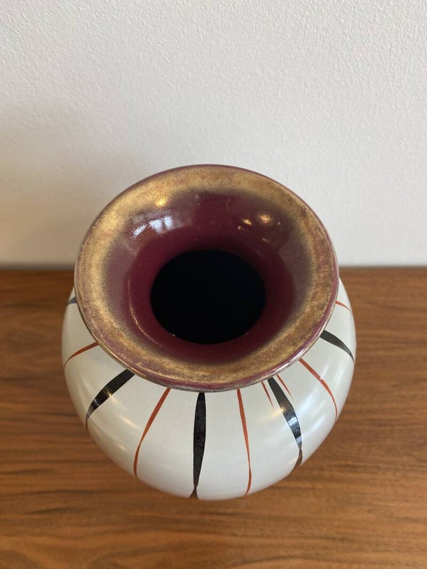 Bijzonder West Germany vaasje; grijze basis en handbeschilderde verticale banen in rood en zwart. De binnenkant is uitgevoerd in geglazuurd auberginerood keramiek. De hals van de vaas is afgewerkt met een goudkleurige rand. Een sierlijk en chique vaasje. De vaas verkeert in goede vintage staat; geen chips of scheuren.