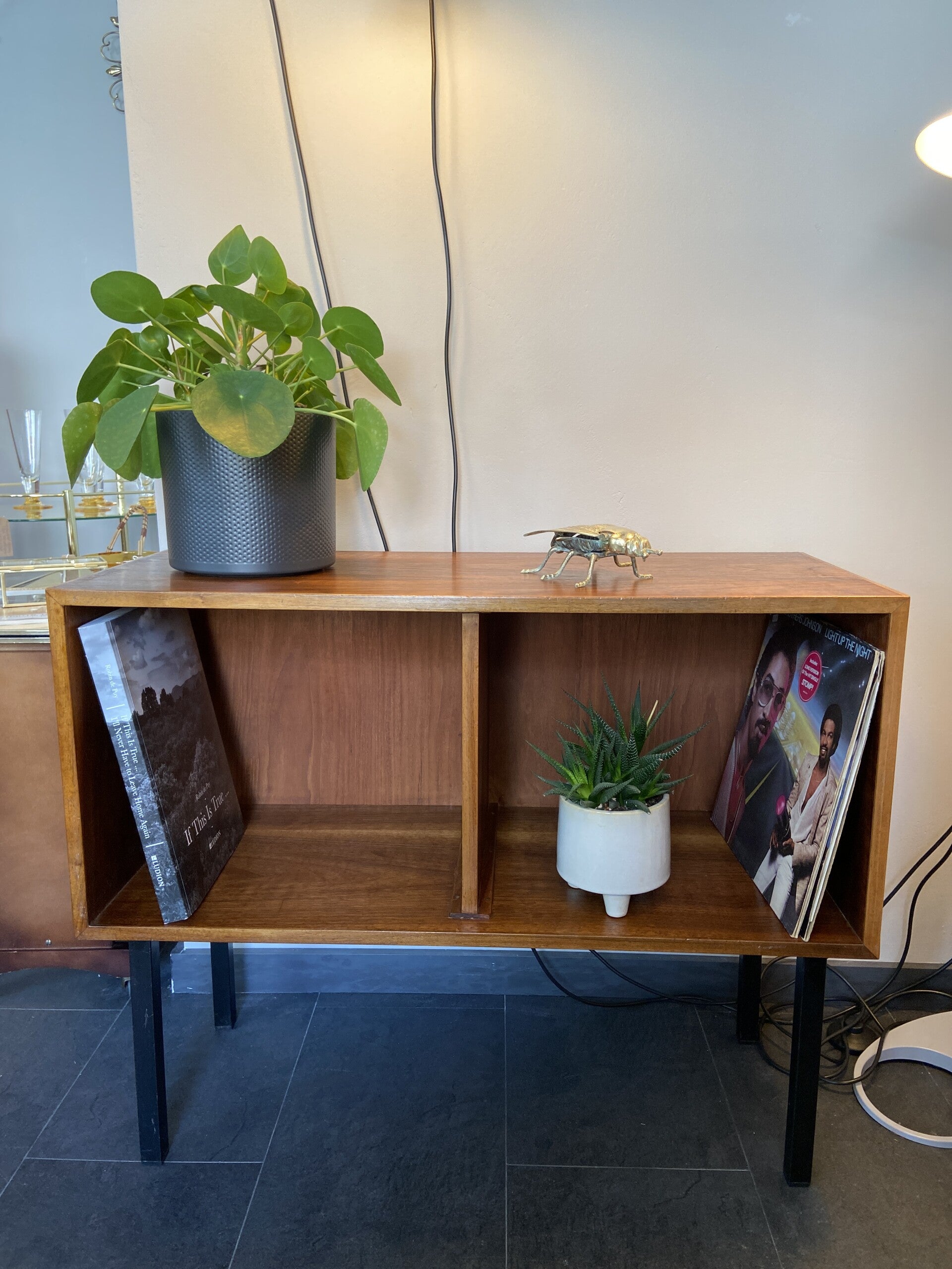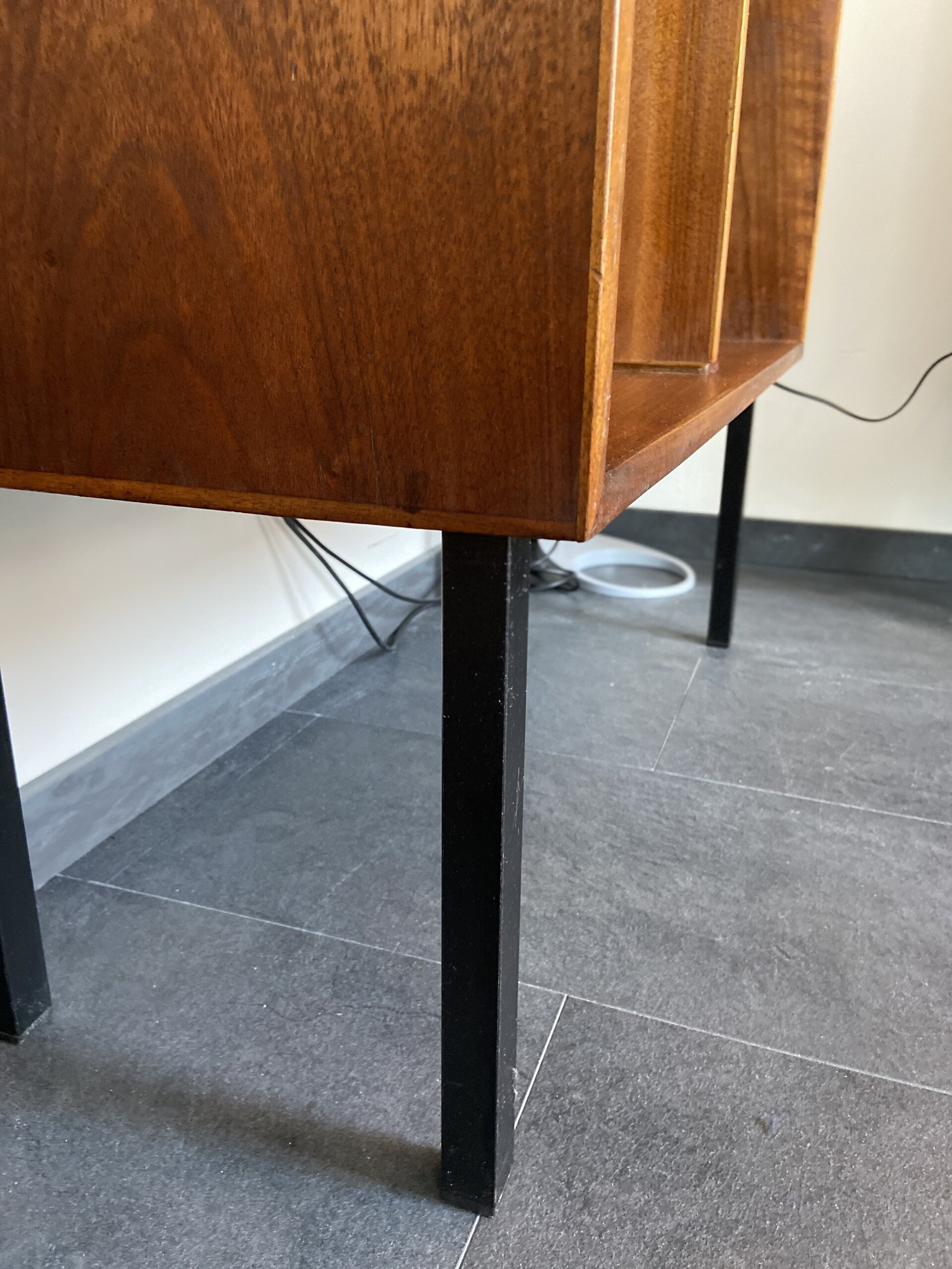 Dit open kastje van teakfineer is weer een typisch voorbeeld van Scandinavisch strak design! Zeer functioneel en prachtig in zijn eenvoud. De kast staat stevig op zwart metalen poten en heeft 2 open vakken waarin je al je favoriete lp's, boeken of andere spullen kwijt kunt die je graag in het zicht wilt zetten! De kast verkeert in een mooie vintage staat, met gebruikssporen die passen bij de leeftijd (jaren '60). Aan de rechterkant heeft de kast wat vlekjes in het fineer; hiermee is rekening gehouden bij de prijsbepaling.