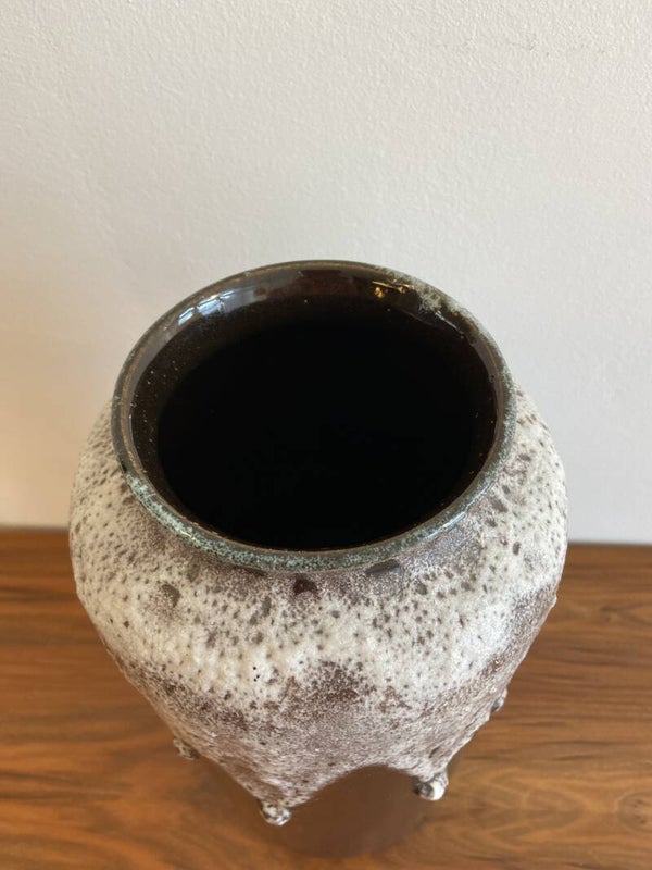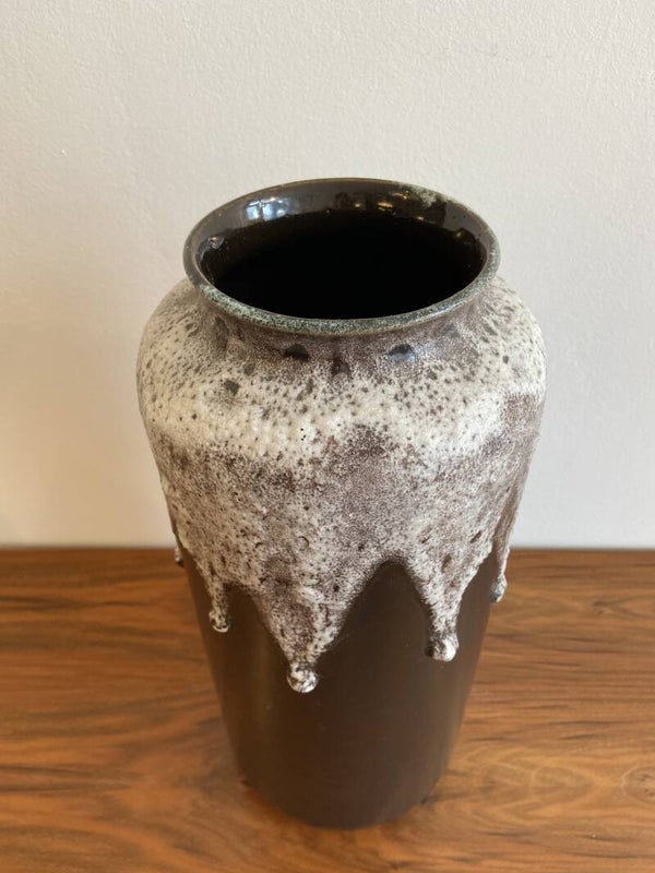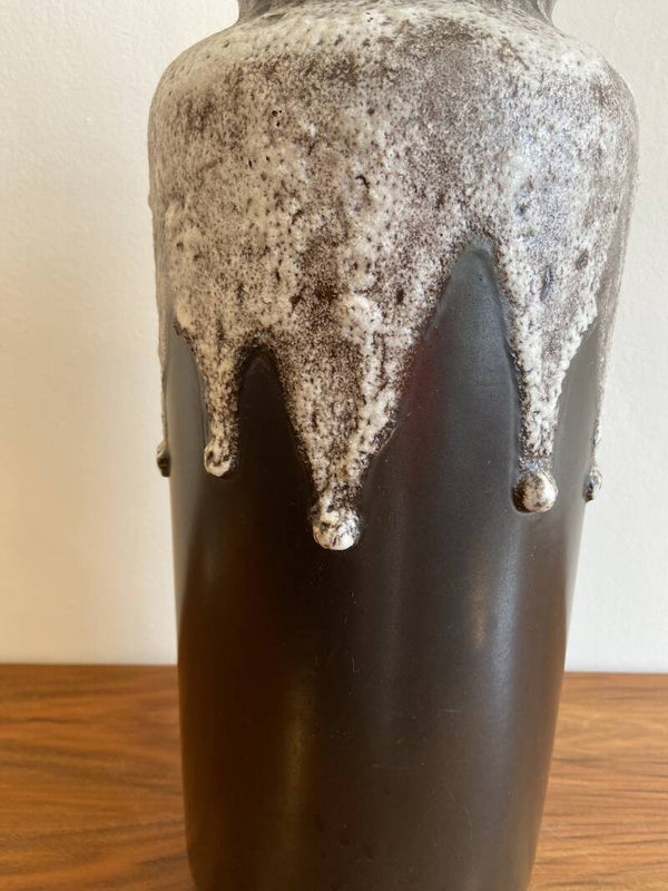 Stoere vaas van Bay uitgevoerd in mat donkerbruin keramiek met een dikke fat lava rand aan de bovenzijde in wit/grijs. De vaas is gemerkt: 70-40 en verkeert in uitstekende conditie; geen beschadigingen of chips.