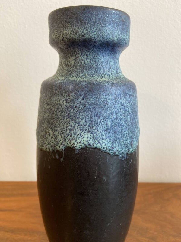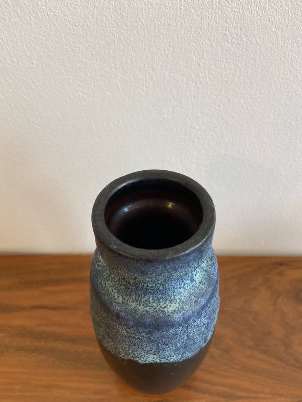 Prachtig vormgegeven vaasje van Scheurich, uitgevoerd in zwart mat keramiek met aan de bovenkant een rand van blauwe keramiek met fat lava accenten. De vaas verkeert in uitstekende conditie; geen beschadigingen. De vaas is gemerkt: 210-18.