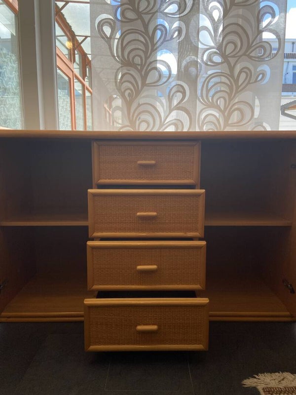 Een zonnetje in huis dit rotan dressoir! Gemaakt in de jaren '70/’80 van stevig materiaal; het gaat dan ook om een robuust exemplaar dat je niet zomaar in je eentje verplaatst :-) Het biedt heerlijk veel opbergruimte: links en rechts een kast met plank en in het midden maar liefst 4 soepel lopende laden! Het dressoir was onderdeel van een grotere wandkast; er heeft een vitrinekast op gestaan waardoor er kleurverschil is ontstaan. We hebben dit wat bijgekleurd en vinden hem nu prima. Natuurlijk kun je ervoor kiezen om het blad te schuren en opnieuw te beitsen. Maar als je hem lekker stylet met je favoriete planten, kaarsen, boeken en andere spullen; zie je er sowieso niets van. Bij wie mag dit zonnetje binnenkort staan shinen?