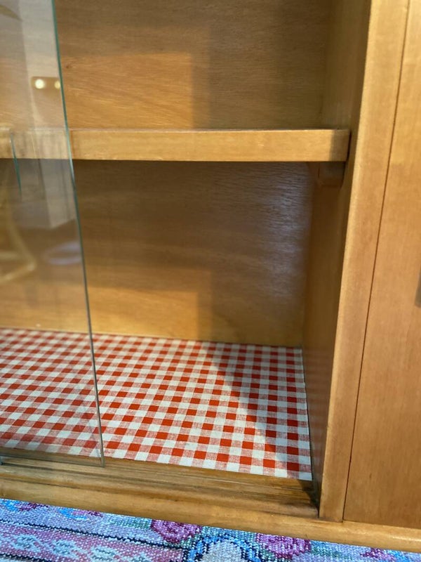 Wat een leuk en bijzonder kastje is dit! Zeer stevige kwaliteit! Het kastje heeft nog oud rood/wit geblokt kastpapier; dit kun je natuurlijk gemakkelijk vervangen, maar wij vonden het wel sfeervol :-) Het kastje is robuust maar ook sierlijk door de schuine poten en de glazen deuren met ingeslepen handgreep. Het glas is in goede staat; geen beschadigingen. Het kastje heeft boven op het blad wat gebruikssporen en er is een reparatie aan het hout uitgevoerd; dit is netjes gedaan. Het kastje zou voor wat meer glans opnieuw gebeitst kunnen worden als je daar van houdt.