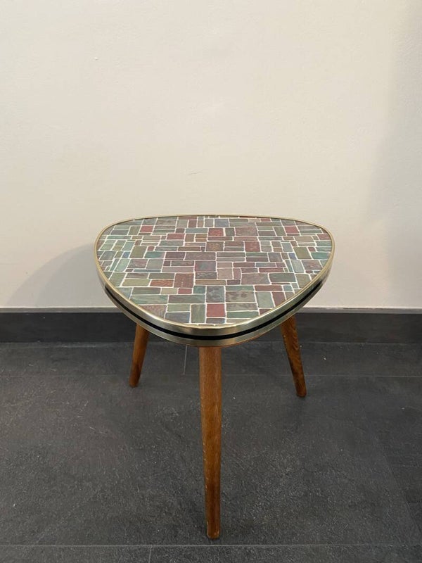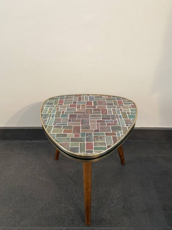 Bijzondere planten-/bijzettafel met een gedecoreerd blad in een soort tegelpatroon, in div. kleuren groen en roze. Het blad is afgezet met een goudkleurige band met zwarte streep. De tafel staat op mooie schuine houten poten en verkeert in zeer goede staat. Het blad heeft geen beschadigingen.