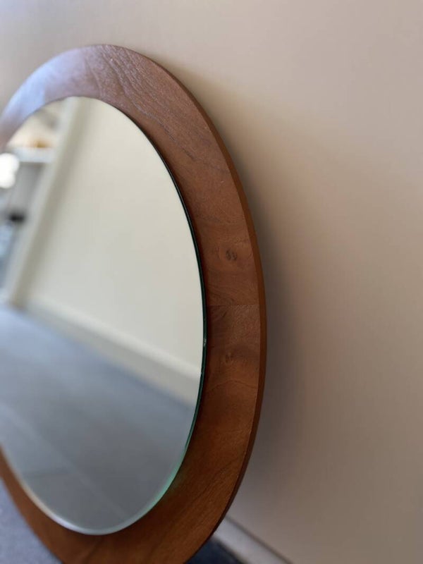 Mooie, ronde vintage teak spiegel uit Denemarken, jaren '60. De spiegel is bevestigd op een teakhouten frame met een prachtige houttekening. Zowel spiegel als frame verkeren in zeer goede staat. Deze spiegel komt overal goed tot zijn recht; woonkamer, slaapkamer, hal, badkamer.