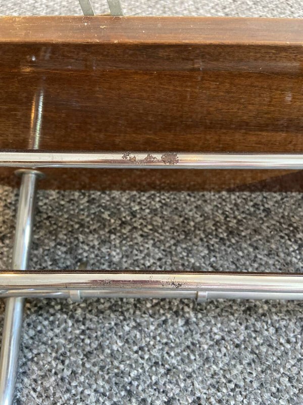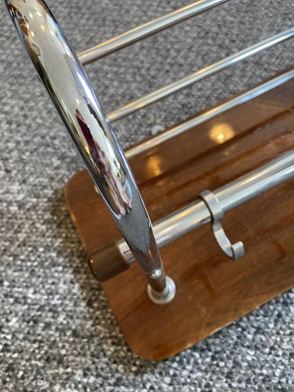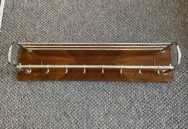 Zeer mooie en goed bewaard gebleven vintage kapstok in Bauhausstijl, uitgevoerd met een teakhouten achterplaat en 9 jashaken en hoekenplank van chroom. Zoals op de foto's te zien is verkeert de kapstok in goede vintage staat maar zijn er op enkele plekken wel wat sporen van roestvorming te zien; dit zou je nog kunnen behandelen als het stoort. Als de kapstok hangt en in gebruik is zie je hier niets van. Er is wel rekening mee gehouden in de prijsbepaling.