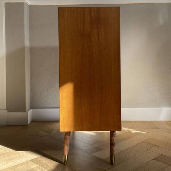 Ben je nog op zoek naar een compact platenkastje? Misschien is dit hem wel! Een open vak waarin je je versterker of andere spullen kwijt kunt en maar liefst 4 vakken om je favoriete lp’s te ordenen! Het kastje is uitgevoerd in 2 kleuren teakfineer en staat op nieuwe pootjes met messing sok. De staat van de kast is gezien de leeftijd goed. De foto's zijn onderdeel van de beschrijving.
