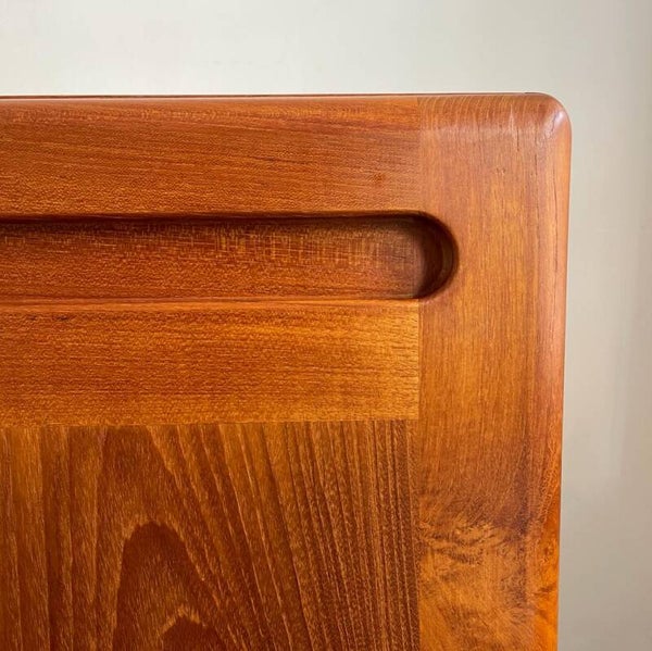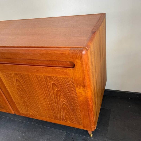 Ben je op zoek naar een compact dressoir met veel bergruimte? Dat stoer, stijlvol en in een geweldige staat verkeert? Misschien is dit hem wel! Dit Deense dressoir is gemaakt van teakfineer met deuren van massief teakhout! Kijk eens naar die geweldige houttekening en sierlijke uitgefreesde handgrepen! Binnenin heeft het dressoir 2 legplanken en links een lade met vilt. In topconditie! De kast staat op nieuwe poten met messing sok.