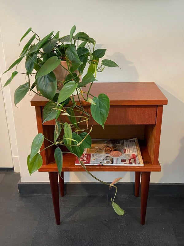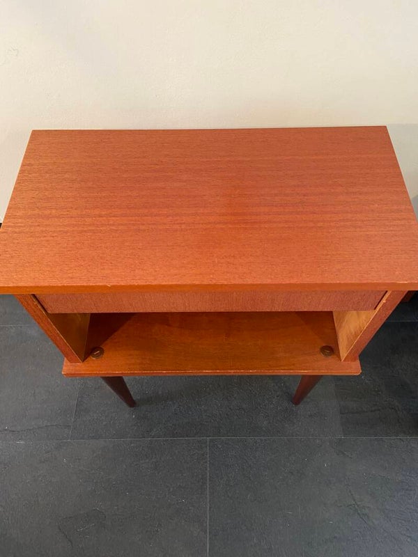 Stijlvol, strak en chique Frans nachtkastje van teakfineer met lade. Het kastje staat op hoge, taps toelopende poten verkeert in mooie vintage staat. Aan de binnenkant van de lade zijn wat gebruikssporen zichtbaar; zie foto. Leuk als nachtkastje, maar ook in de hal voor je sleutels e.d. of als bijzettafel!