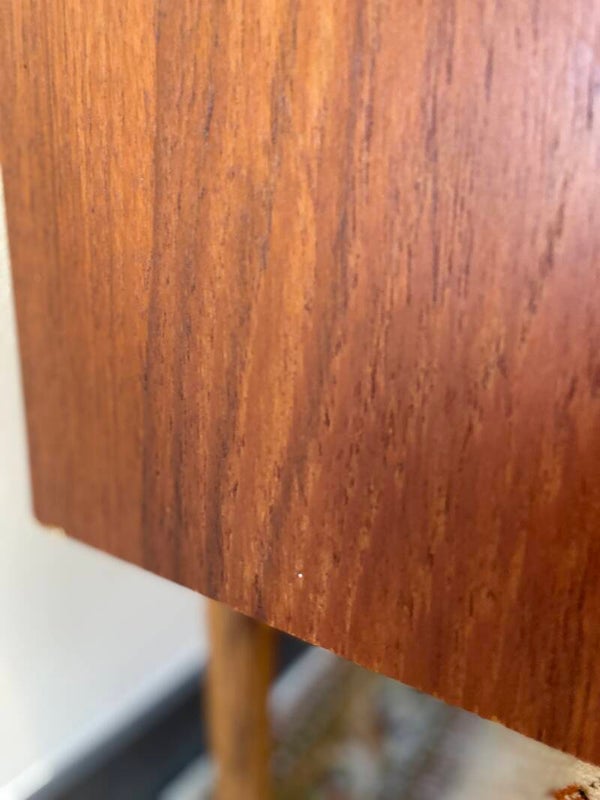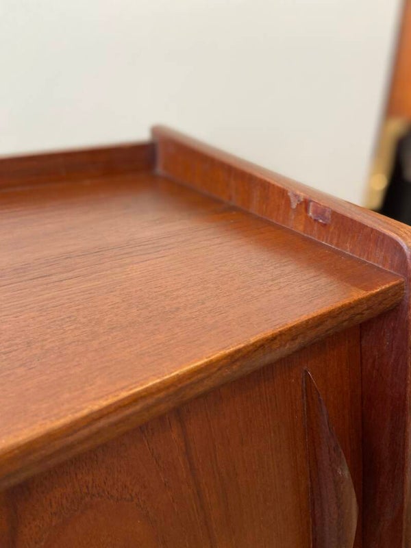 Klein maar fijn is hier zeker van toepassing! Wat een prachtig verfijnd meubel is dit! Een compacte kast met 2 schuifdeuren met prachtige handgrepen, waar Deense meubels om bekend staan. Het kastje is uitgevoerd in een mooie kwaliteit teakfineer en staat op een stevig onderstel met conische poten. Zet er je TV op, of gebruik hem als kleine opberger, ook leuk in de hal met een spiegel erboven! De kast verkeert in een mooie vintage staat en heeft wat kleine gebruikssporen opgelopen in de jaren aan de randen aan de bovenkant. Zie hiervoor ook de foto's die onderdeel zijn van de beschrijving. Deze nauwelijks zichtbare sporen doen wat ons betreft niets af aan de schoonheid of charme, maar goed om te weten ;-)
