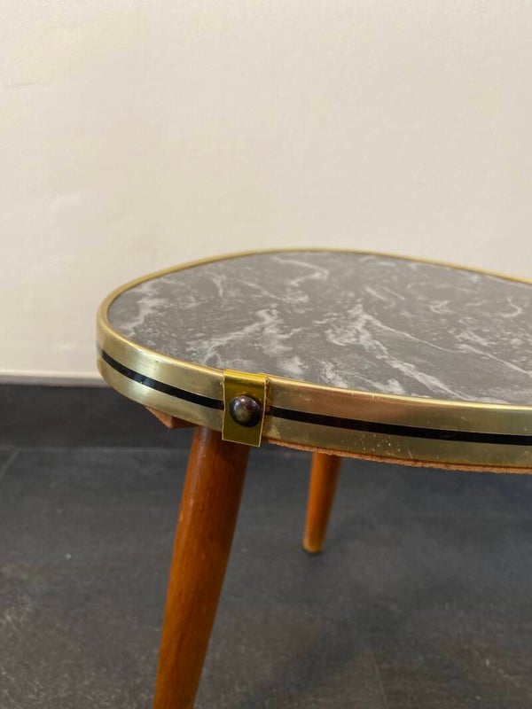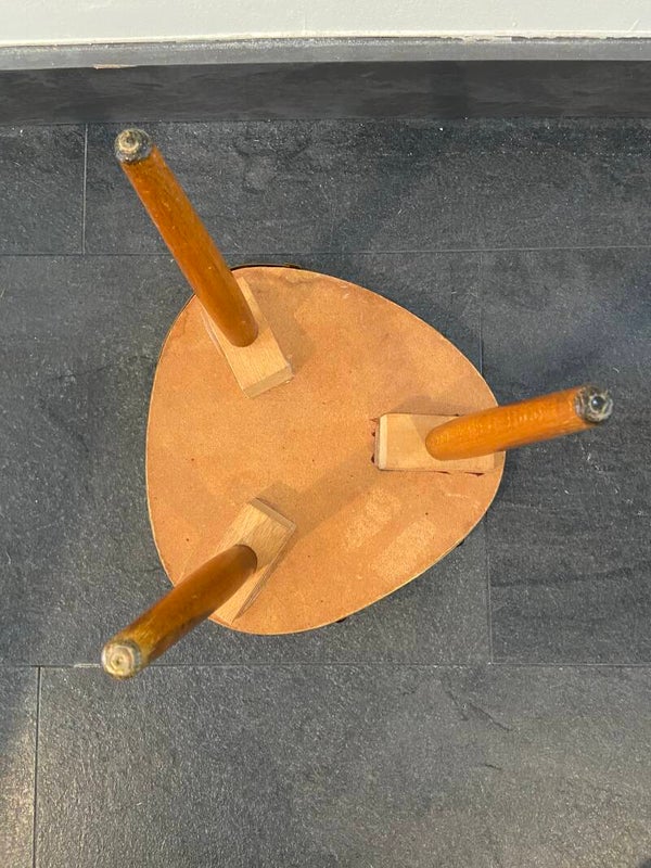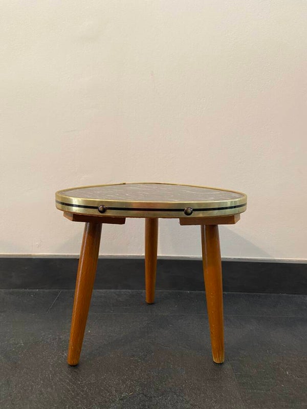 Superleuk klein plantentafeltje in zeer goede vintage staat. Het blad vertoont geen gebruikssporen en de honingkleurige, houten poten zien er ook erg netjes uit. Het blad heeft een messingkleurige rand met zwarte bies. De poten kunnen eraf, zodat het tafeltje verzonden kan worden.