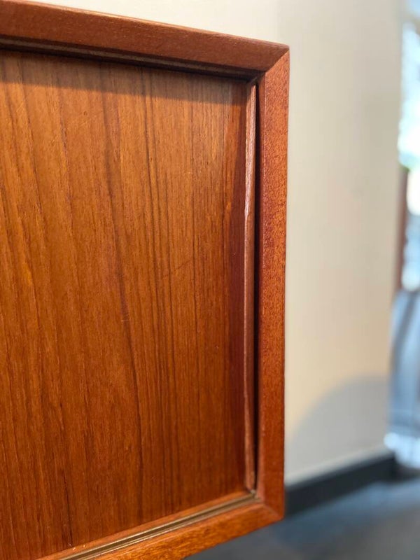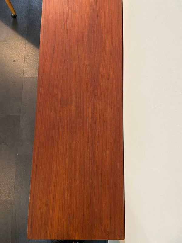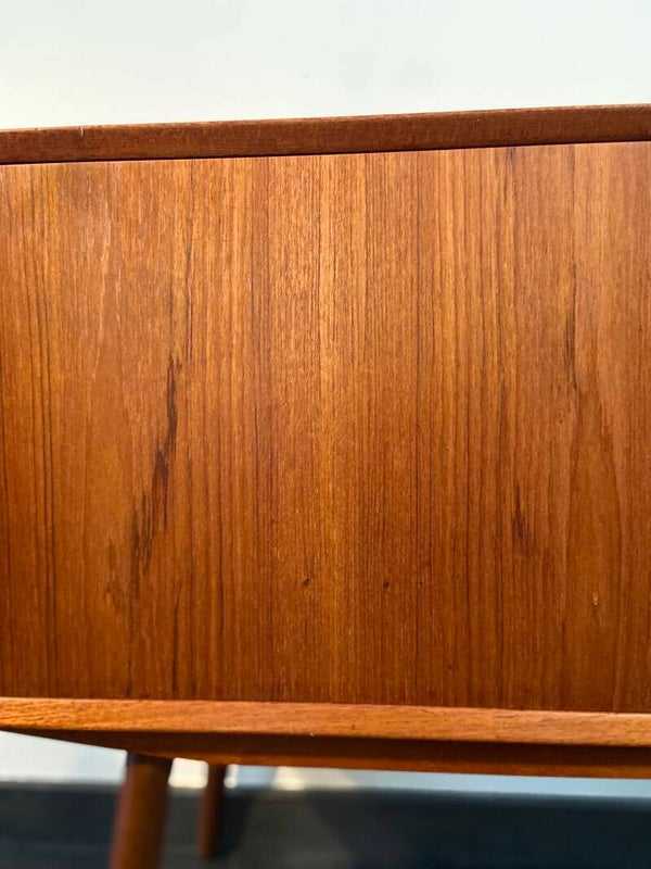 Een kastje om verliefd op te worden! Dit compacte dressoir met schuifdeuren is zó mooi gevormd; die gebogen, doorlopende handgrepen, de hoge taps toelopende poten, het warme teakhout. Alles aan dit kastje is mooi! Door zijn compacte formaat past hij overal; in de woonkamer bijvoorbeeld met de TV erop, in de hal, slaapkamer, studeerkamer…. Rechts in de achterwand is een gaatje gemaakt, waarschijnlijk om snoeren door te voeren. Zie de foto's die onderdeel vormen van de beschrijving. In dit kastje passen geen lp's.