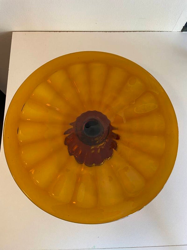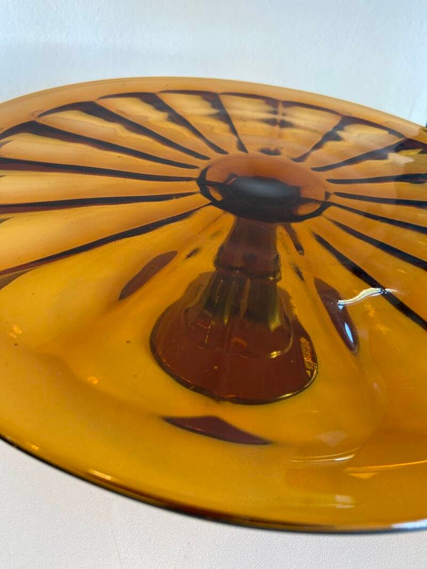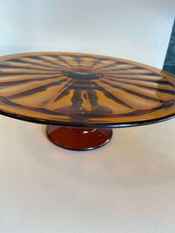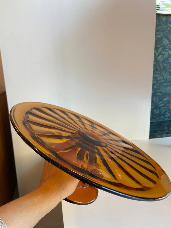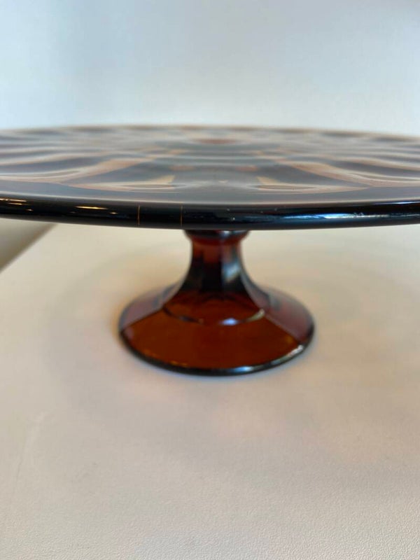 Prachtige vintage taartschaal in een warme amberkleurige uitvoering. Voor taart, maar denk ook eens aan decoraties als kleine pompoenen, dennenappels, kerstballen, kaarsen etc.