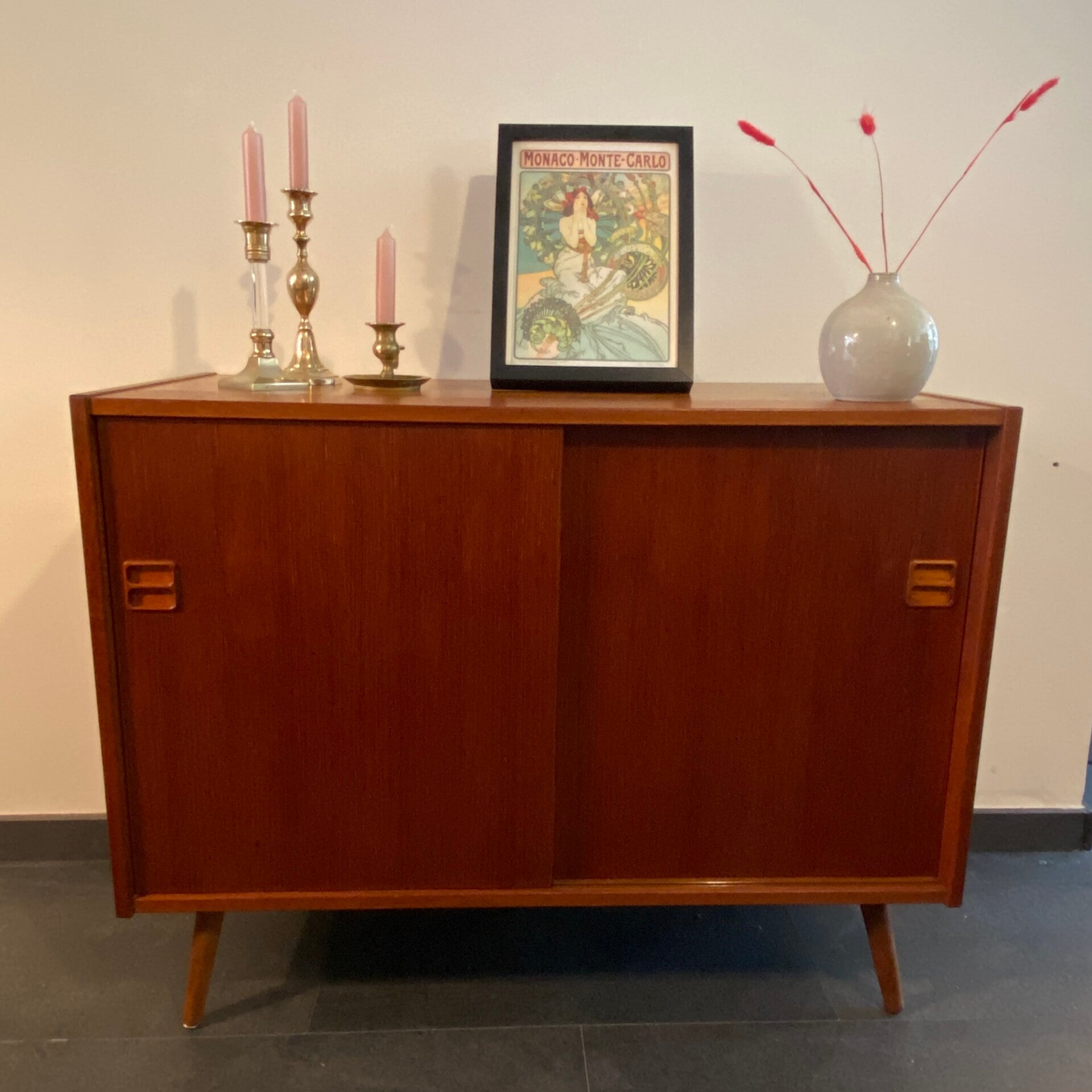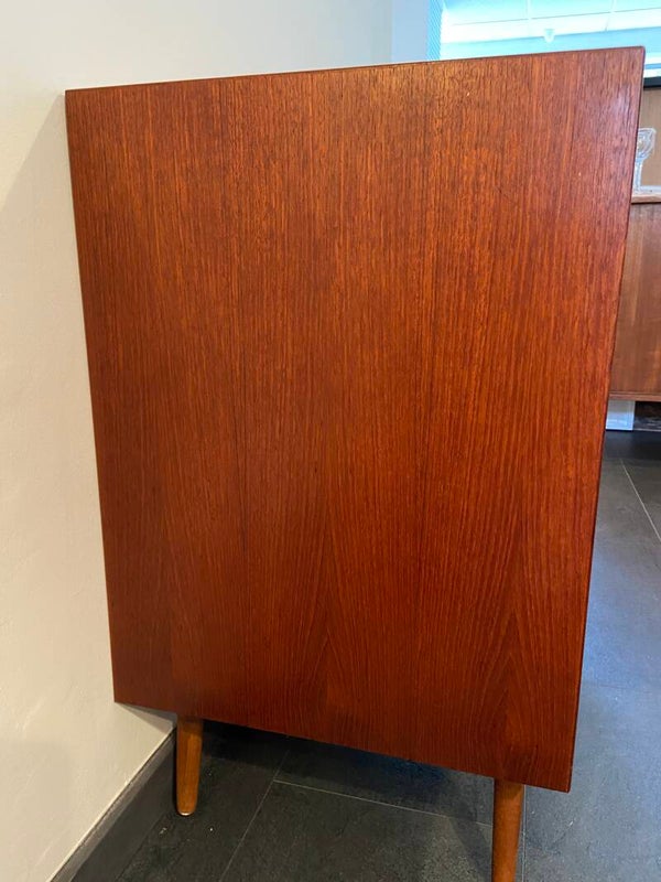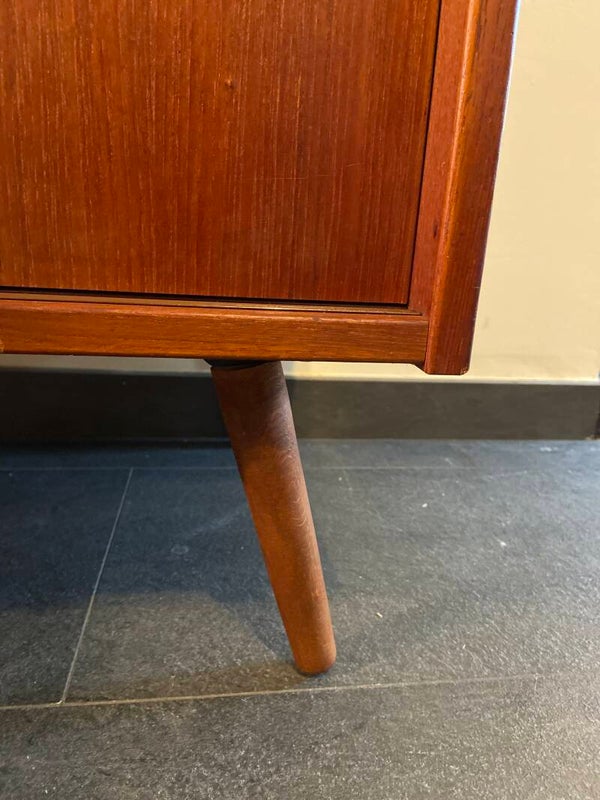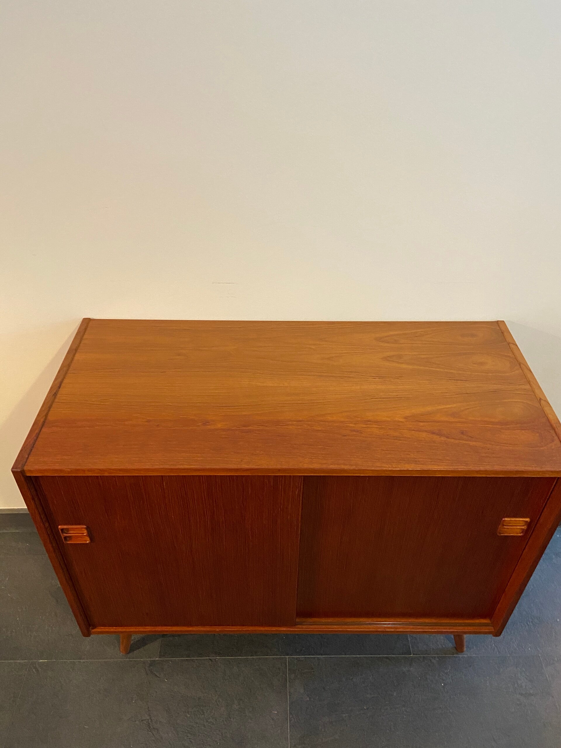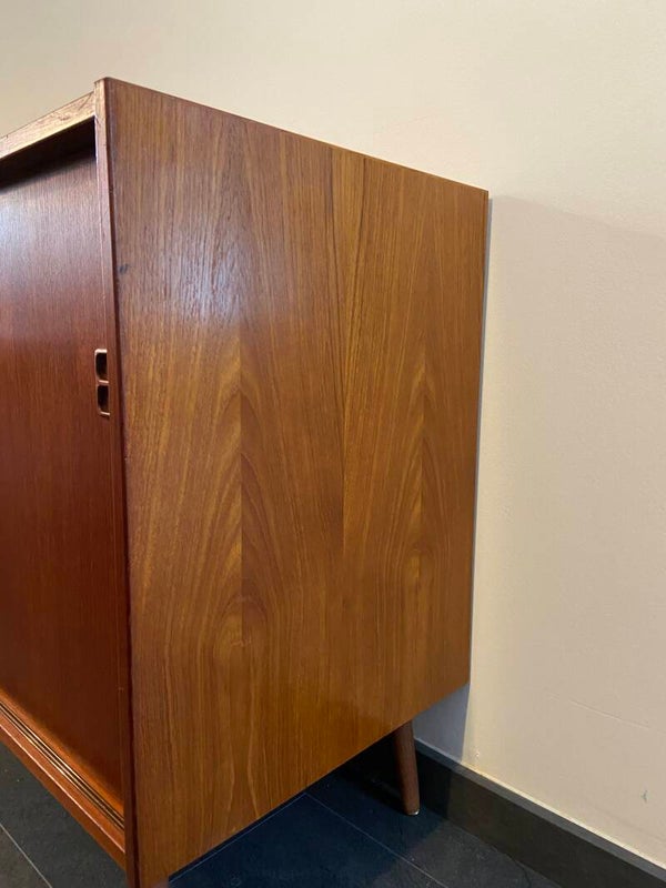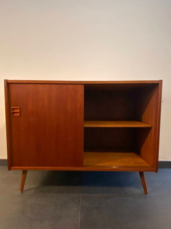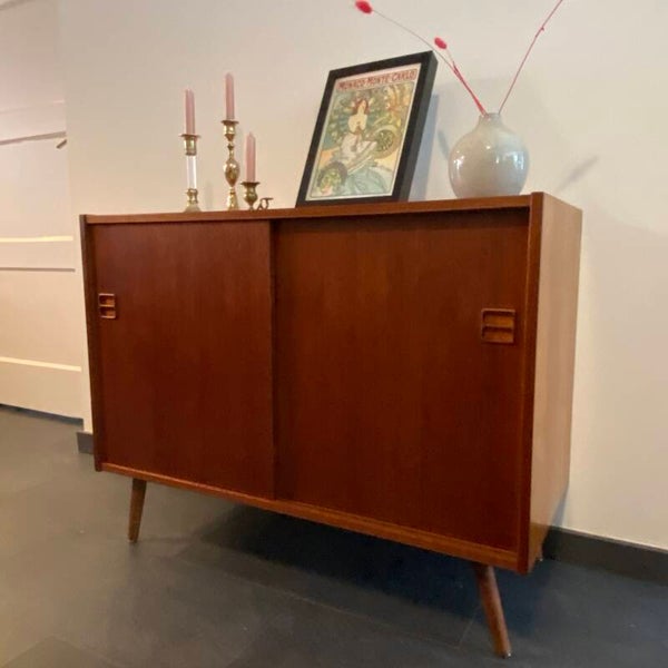 Badkamerkastje/Wandkastje/Klein dressoir. Waar wil jij dit mooie kastje voor gebruiken? Deze handige schuifdeurkastjes zijn ideaal! Door hun afmeting zijn ze op veel plaatsen toe te passen en bieden veel opbergruimte. Sommige worden omgebouwd tot badkamermeubel of mogen shinen als opberger in de woonkamer of slaapkamer! Dit exemplaar is gemaakt van taakfineer en heeft een prachtige houttekening, sierlijke handgreepjes en staat op stevige nieuwe schuine poten. De plank is in hoogte verstelbaar. Geproduceerd in Denemarken in de jaren ’60/’70. Op het bovenblad heeft de kast een licht kleurverschil. Zie de foto's die onderdeel vormen van de beschrijving.