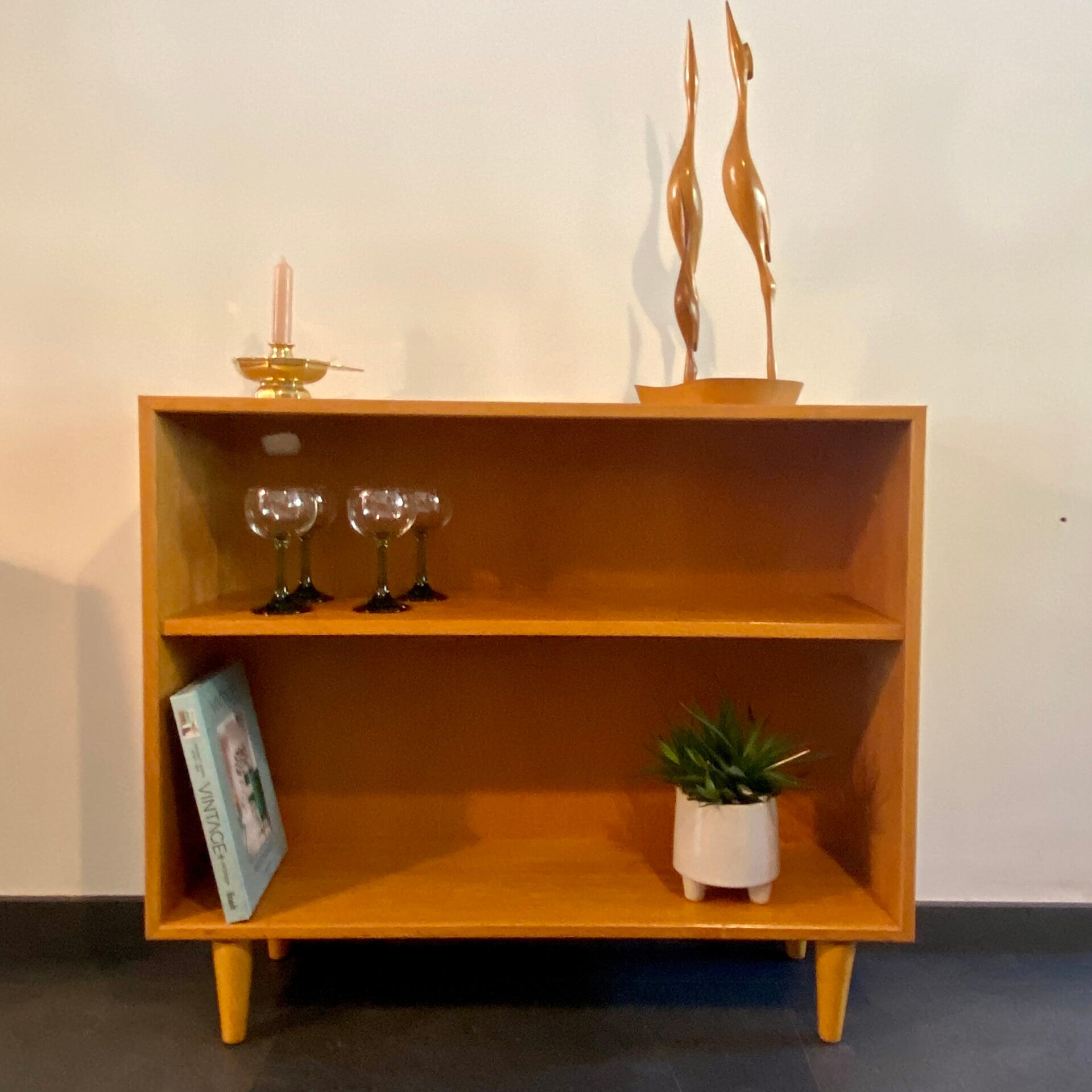 Leuk en strak vintage boekenkastje van eikenfineer. Het kastje staat stevig op nieuwe lage conische poten en verkeert in een mooie vintage staat. Op het bovenblad zijn wat lichte krasjes te zien en de rechterzijkant, bovenaan zijn sporen aan het fineer zichtbaar. Linksboven in de achterwand is een opening gemaakt door de vorige eigenaar, waarschijnlijk voor het doorvoeren van snoeren. Onder invloed van licht is er kleurverschil tussen de zijwanden en bovenblad, maar dit is niet storend vinden wij.