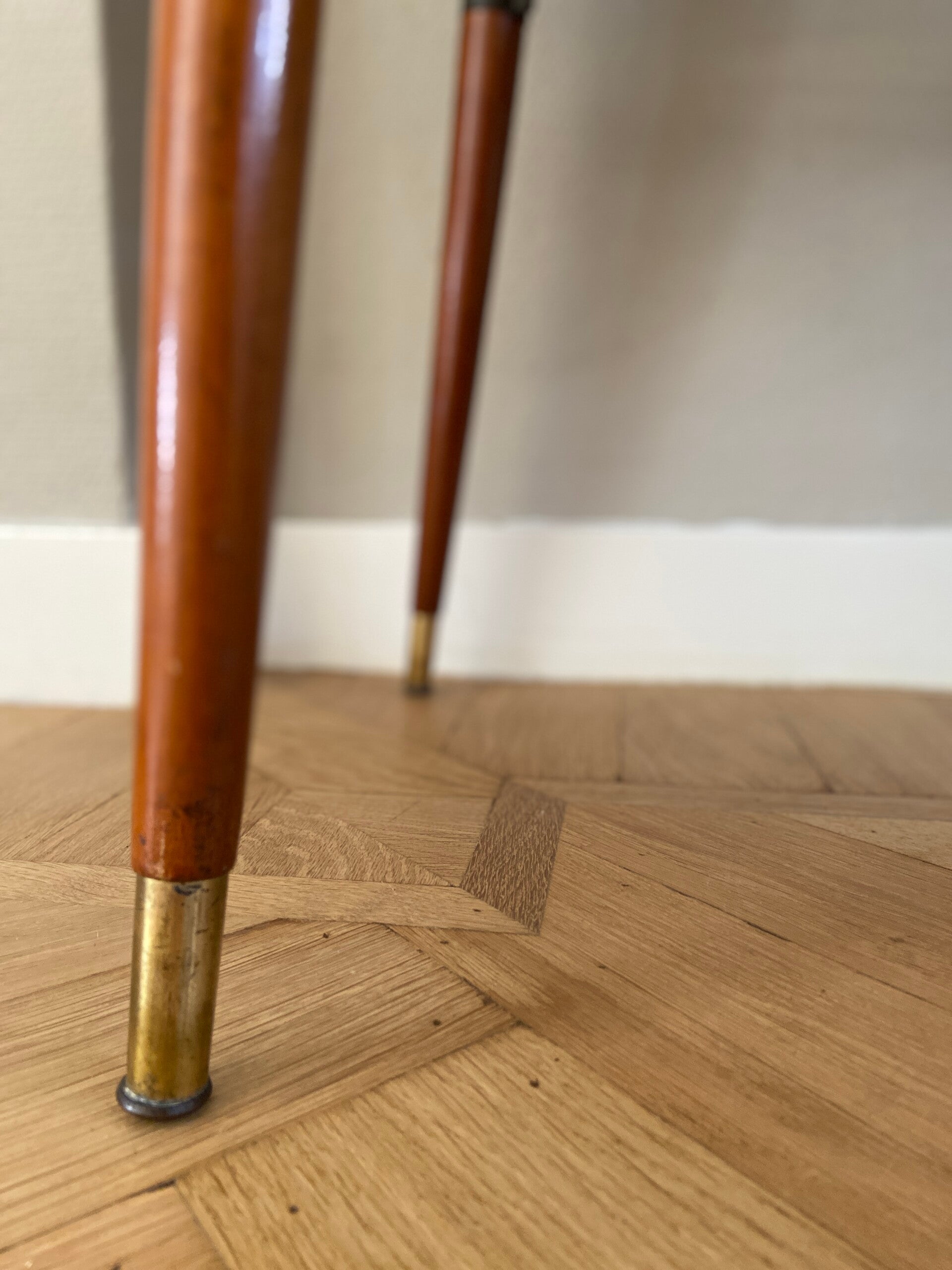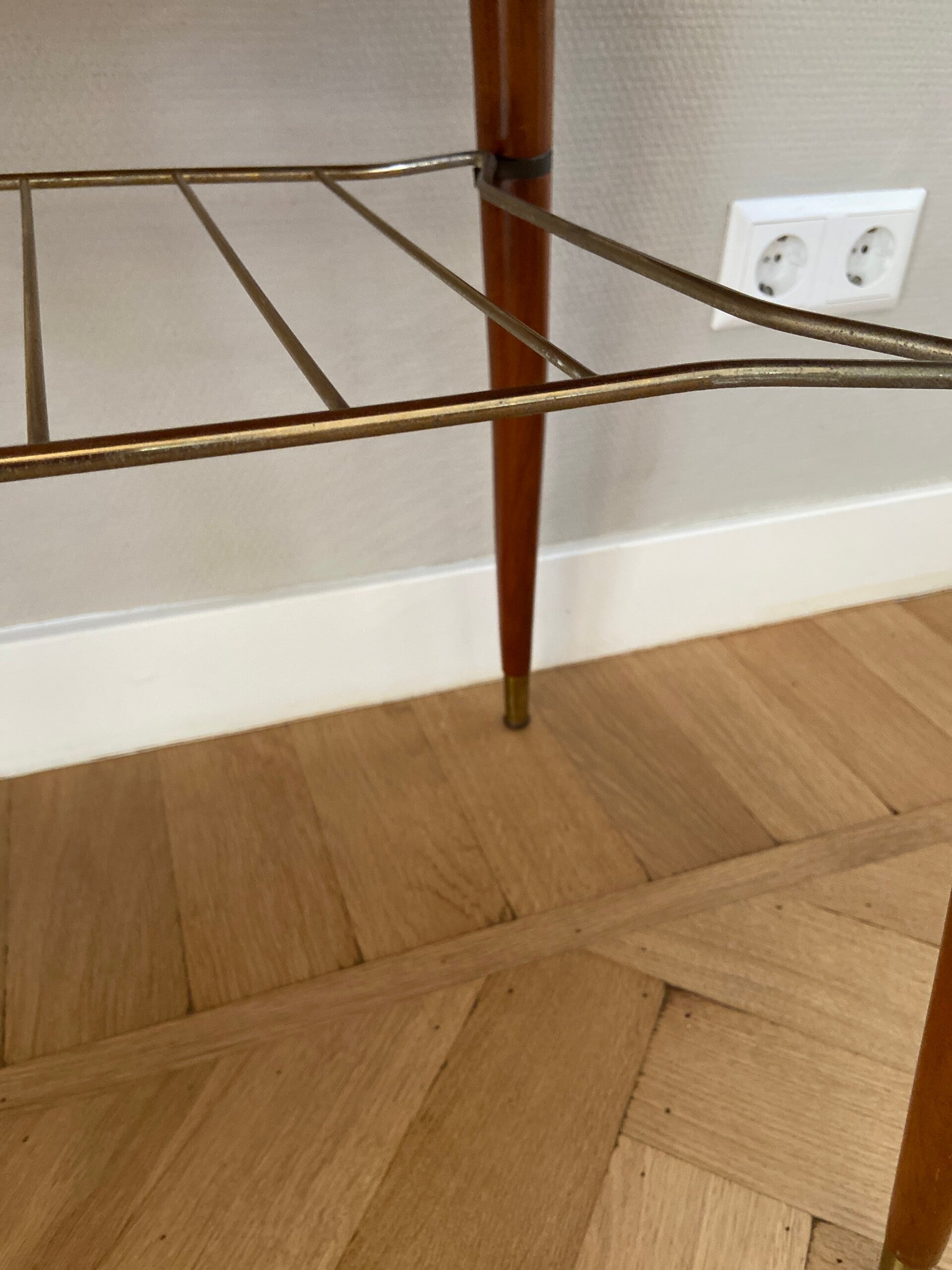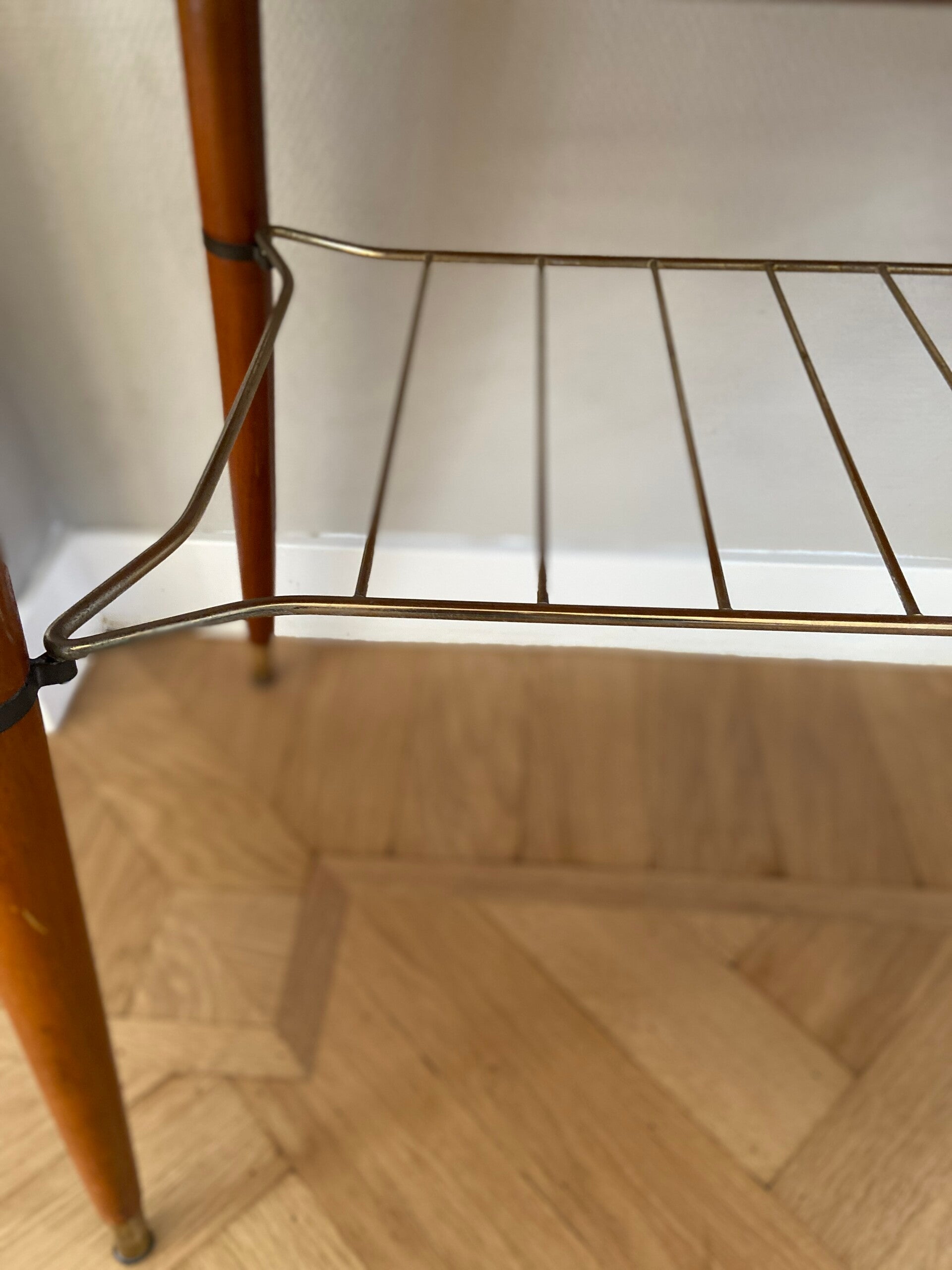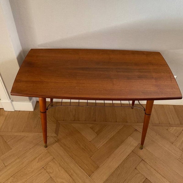 Deze vintage salontafel van warm (noten)hout is in superstaat! Weer een voorbeeld van een meubelstuk dat niet alleen praktisch is maar ook nog eens prachtig van vorm en uitvoering! Deze tafel kan gebruikt worden als salontafel maar ook als bijzettafel/koffietafel. Bijzonder detail is het messing tijdschriftenrek onder de tafel en de hoge conische poten met messing sok! Het tafelblad loopt naar de uiteinden wat taps toe waardoor hij in het midden 50 cm diep is en aan de uiteinden 46 cm; geeft ook nét weer een wat chiquere uitstraling De tafel verkeert in zeer goede staat; minimale gebruikssporen op bovenblad rechts in het midden; zie de foto's die onderdeel zijn van de de beschrijving.