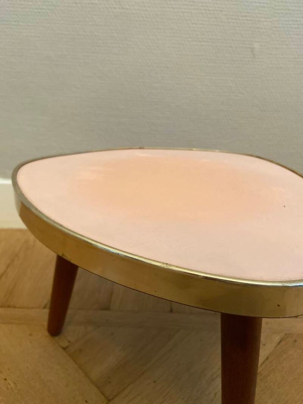 Lief plantentafeltje met roze blad en messingkleurige band. Het tafelblad is in de loop van jaren wat verkleurd onder invloed van licht en potten, maar is nog erg leuk in combinatie met de mooie houten poten! De poten kunnen er niet af, waardoor het tafeltje niet verzonden kan worden.