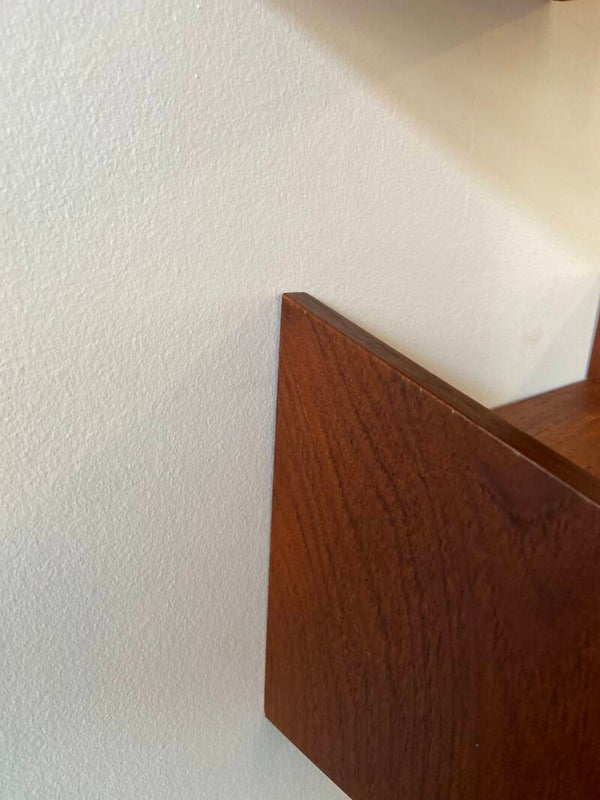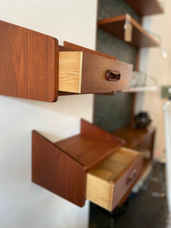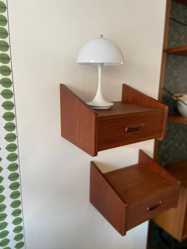 Supermooie set van 2 vintage zwevende nachtkastjes uit Denemarken. Prachtig vormgegeven met afgeronde hoeken en gebogen handgreepjes. De set is gemaakt van teakfineer en verkeert in een zeer mooie vintage staat. Eén kastje heeft wat gebruikssporen op het bovenblad in de vorm van een kring/vlek. Binnen in de de laden zijn gebruikssporen aanwezig. Zie ook de foto's die onderdeel vormen van de beschrijving.