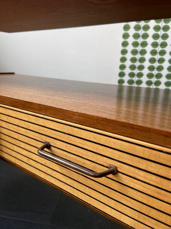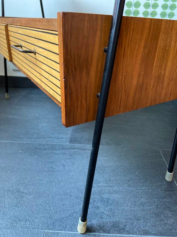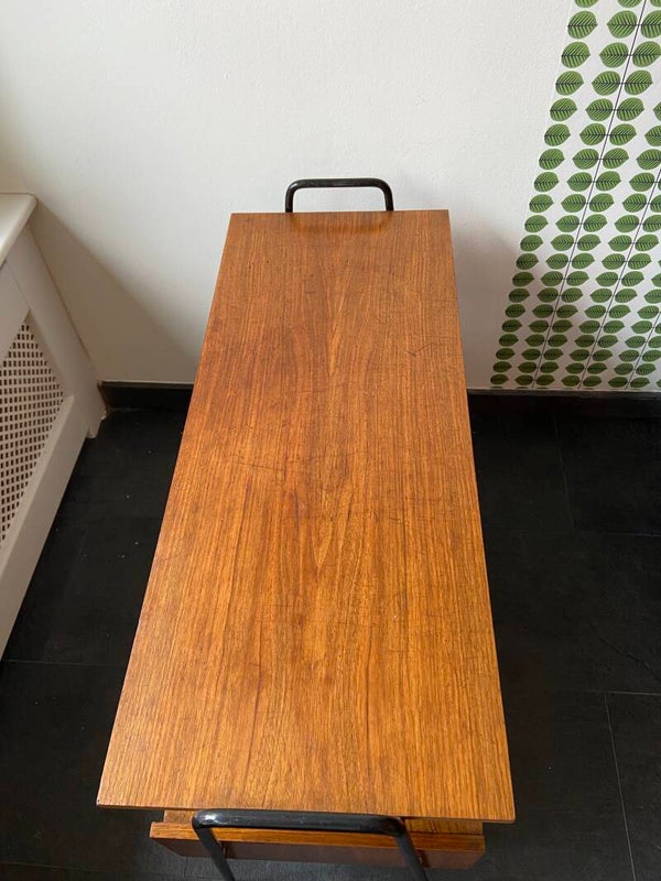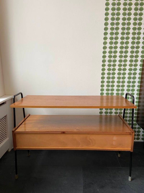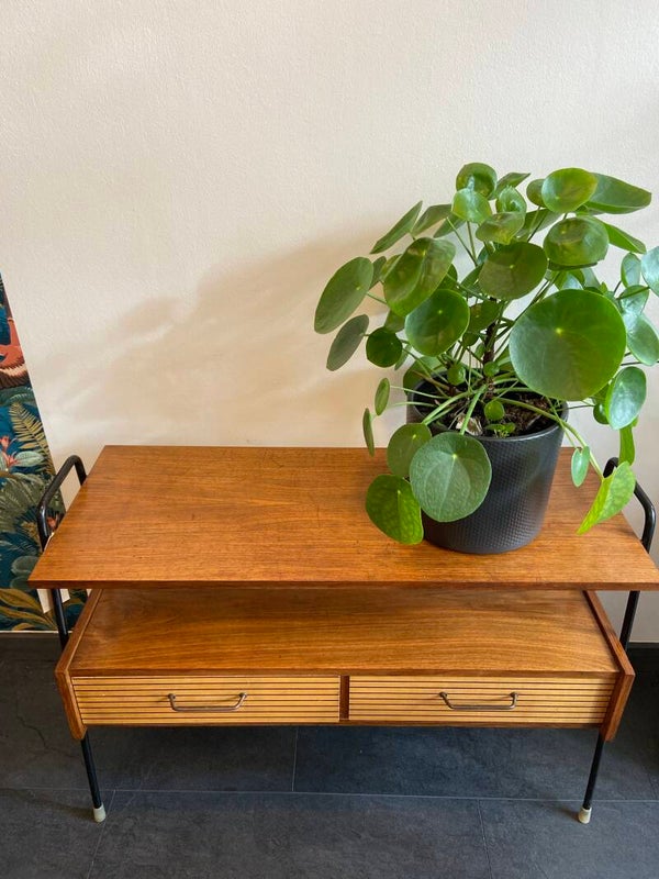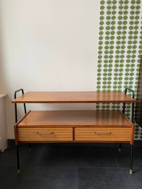 Leuk vintage, praktisch en compact tv-meubel. De combinatie van licht (berken)hout met een frame van zwart metaal geeft dit kastje een stoere en stijlvolle uitstraling. De twee laden bieden bergruimte voor kleine spullen. Kleine deukje aan voorzijde in het midden van de kast; zie hiervoor de laatste foto. Verder verkeert de kast in een goede vintage staat.