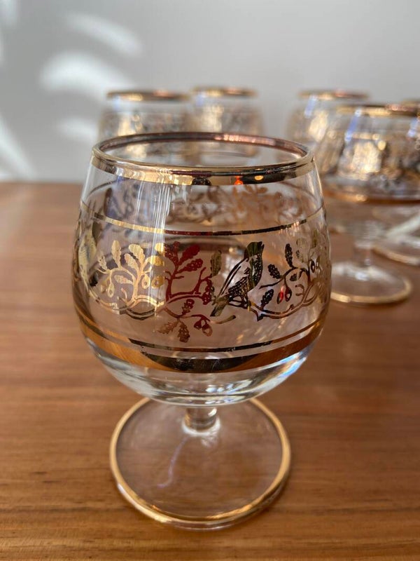 Prachtige set van 6 vintage kleine cognac- of likeurglazen, rijk gedecoreerd met gouden randen en vogels. De set verkeert in goede vintage staat en heeft geen chips e.d.