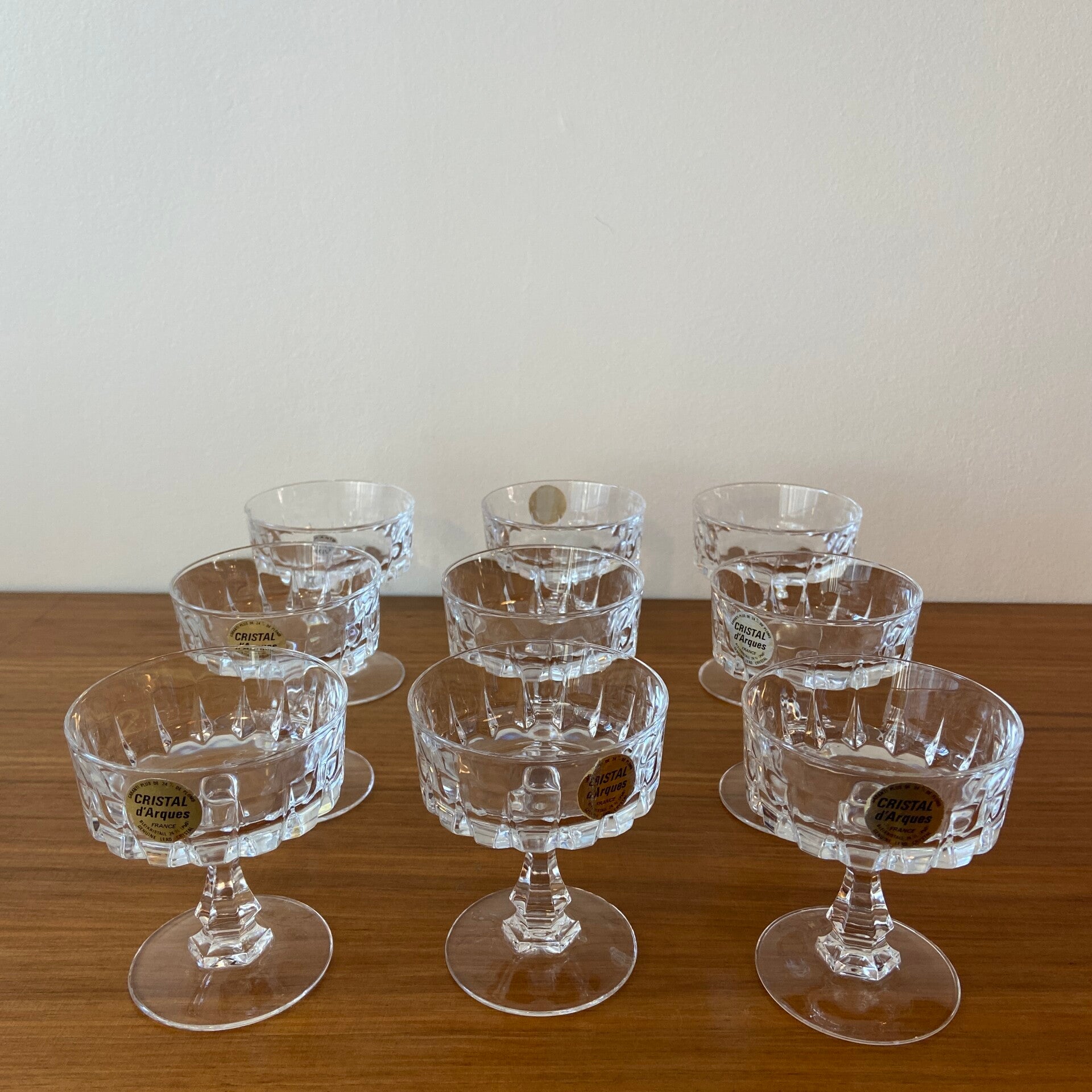 Geweldige set van maar liefst 9 kleine kristalles coupes van Cristal d'Arques! Dit zijn geen champagnecoupes! Leuk om likeur te serveren maar ook superchique om een voor- of nagerecht te serveren bij het (kerst)diner! De set verkeert in zeer goede staat; geen chips e.d. Aan de stickers op de glazen te zien is de set zelfs niet gebruikt!