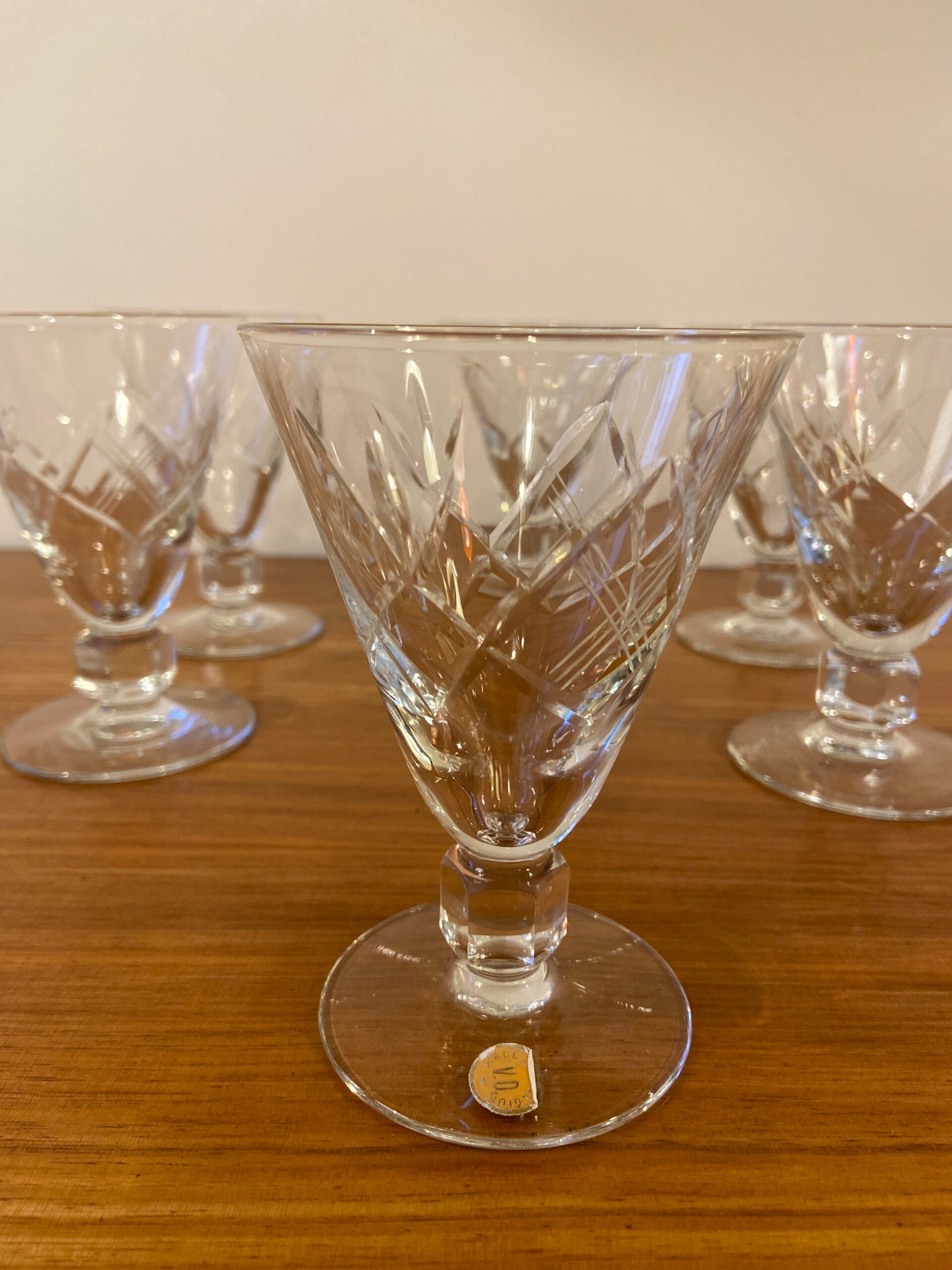 Erg mooie set van 6 vintage cocktail-/wijnglazen uit België met een bewerkte kelk en steel. Gezien de stickers op sommige glazen, lijkt de set ongebruikt! De set verkeert in zeer goede staat.