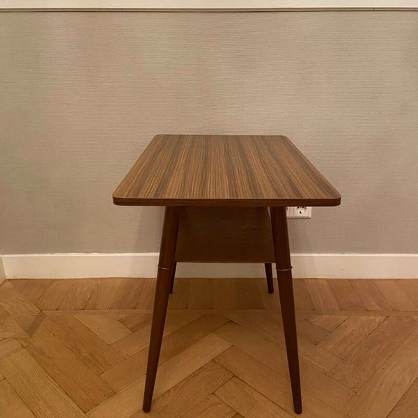 Vintage bijzettafel met gelamineerd blad en tijdschriftenhouder