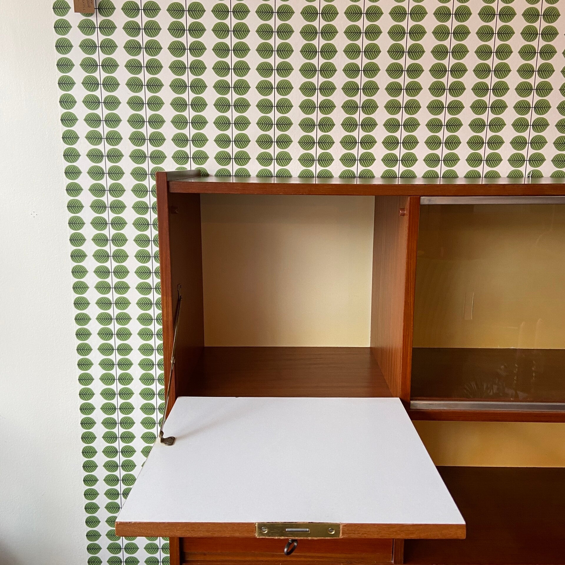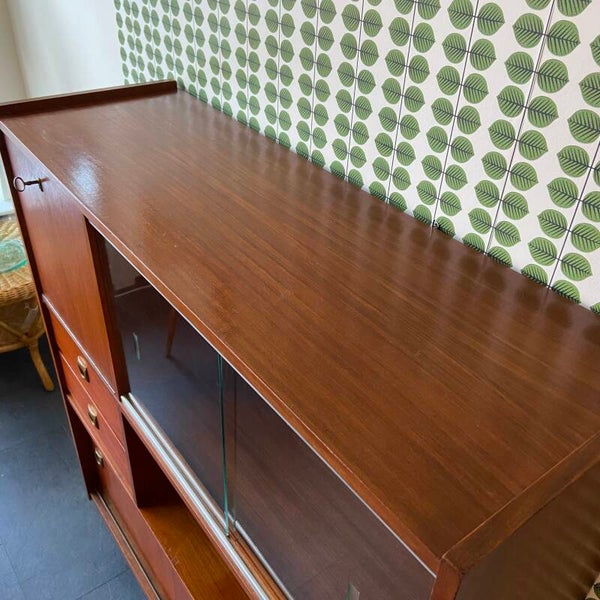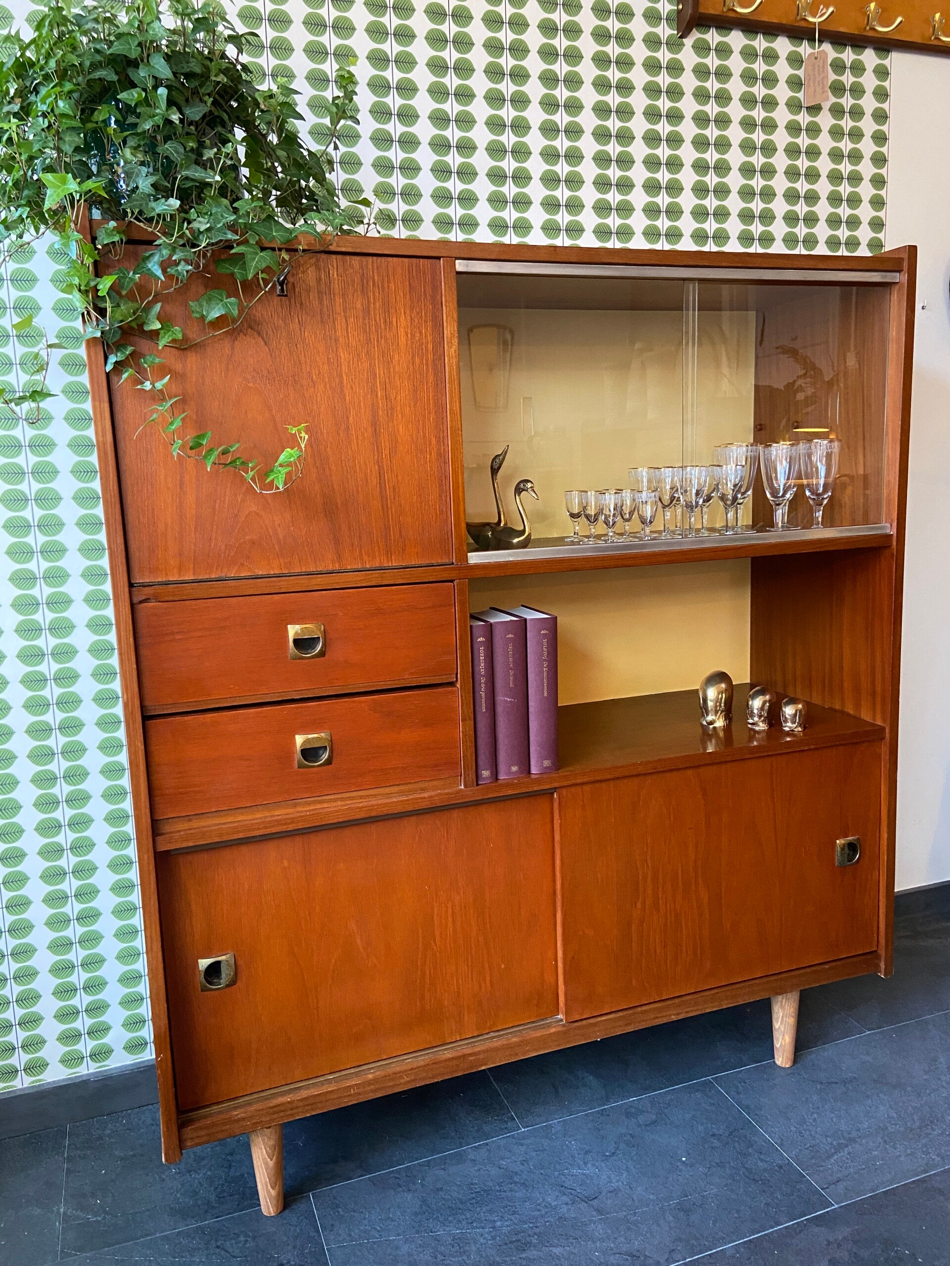 Wat een charmante verschijning is deze vitrinekast! Uitgevoerd in teakfineer met 2 glazen schuifdeuren, links een klep met open vak daarachter, 2 laden en onderin 2 schuifdeuren. De kast is compact van formaat maar biedt veel bergruimte! Er zijn nieuwe pootjes onder gezet en aan weerskanten onderaan is een nieuw beschermlatje aangebracht. Ook heeft de klepkast een nieuw slot gekregen, zodat hij goed afgesloten kan worden. De kast heeft zeker wat kleine gebruikssporen, zo zijn de achterwanden in de loop der tijd wat verkleurd, en is er hier en daar een plekje in het hout. Dit is te zien op de foto's die onderdeel vormen van de beschrijving. De handgrepen zijn messingkleurig en vertonen wat patina. In de achterwand zijn 2 bescheiden gaatjes gemaakt, waarschijnlijk om snoeren door te voeren; er kan dus verlichting worden aangebracht of een platenspeler of ander apparaat worden neergezet :-)