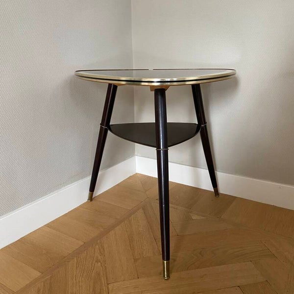 Prachtige koffietafel met een glazen tafelblad met roomwitte rand en geelgouden en rode decoratieve vormen. Het blad heeft een messingkleurige band en zwarte bies. Onder het blad nog een driehoekige plank voor extra bergruimte. De tafel staat op hoge, sierlijke poten met messing sokjes. De tafel verkeert in een zeer mooie vintage staat. Het tafelblad is intact en heeft alleen wat oppervlakkige gebruikskrasjes.