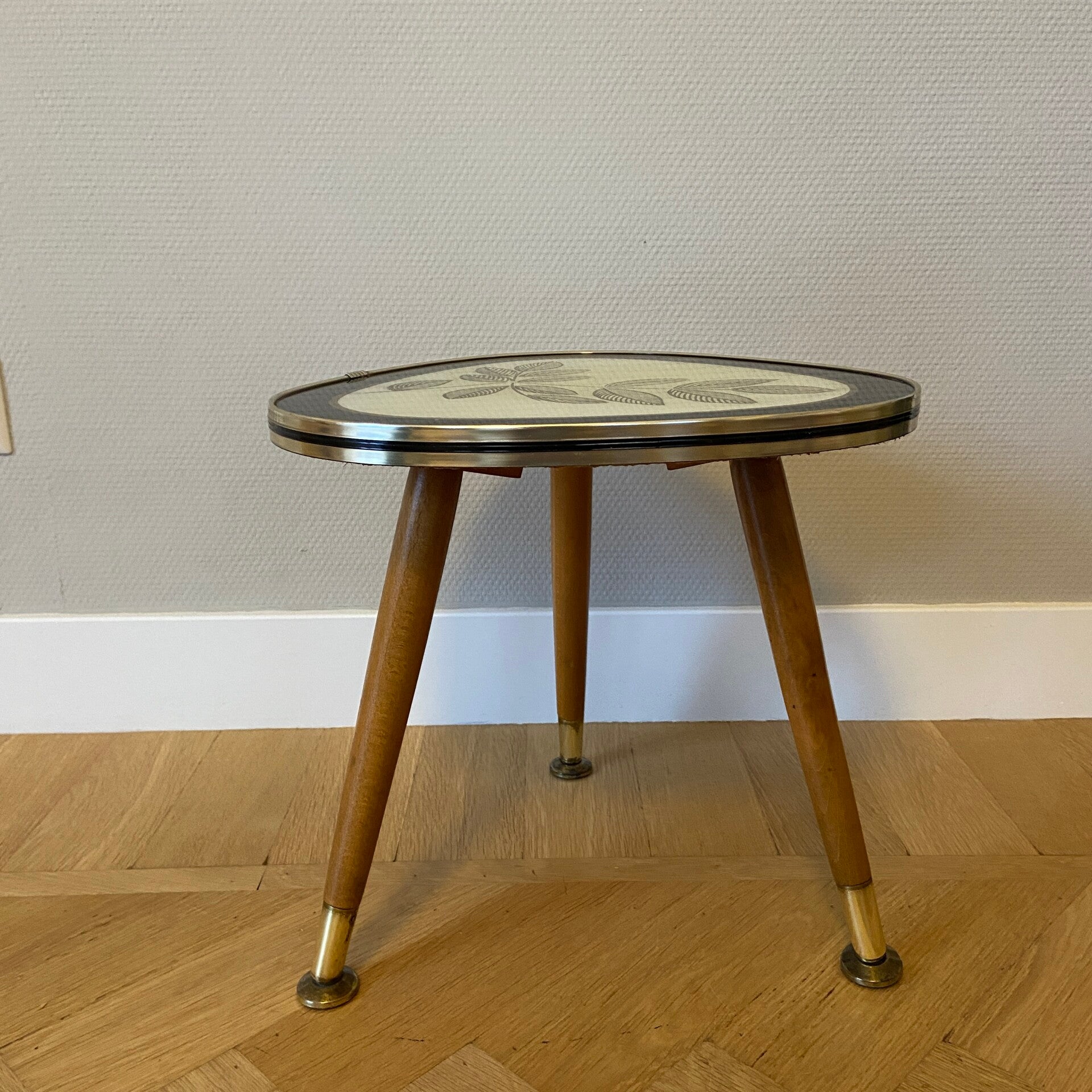 Prachtig bijzettafeltje met glazen tafelblad, uitgevoerd met een zwarte rand en crèmekleurig binnenstuk met goudkleurig bladmotief. Het tafelblad heeft een messing band met zwarte bies. Het tafeltje heeft eiken poten met messing sokjes en stelvoetjes. De poten kunnen eraf voor verzending. Het blad heeft lichte gebruiksporen maar geen breuken of scheuren o.i.d. De tafel verkeert in zeer goede staat; zoals op de foto's te zien is.