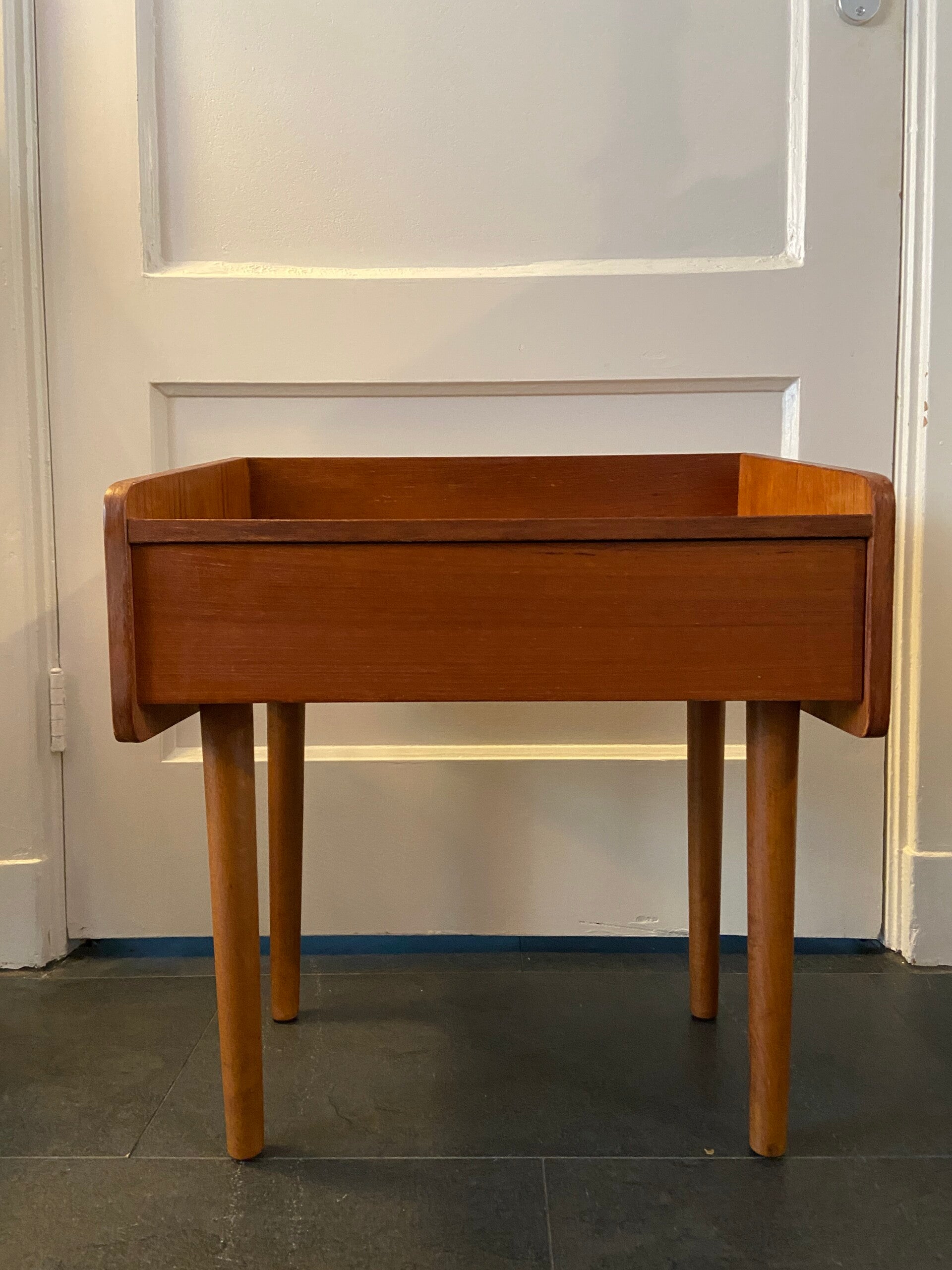 Bijzonder vormgegeven kastje van teakhout met lade. Perfect als nachtkastje maar ook leuk als halkastje of bijzettafel!
