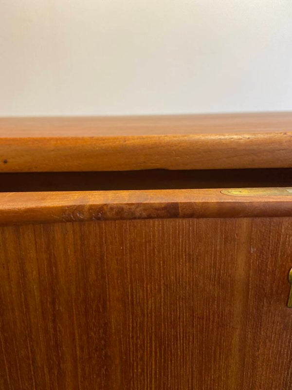 Prachtige Deense 6-ladekast, uitgevoerd in warm in teakfineer. De ladekast heeft maar liefst 6 laden en biedt dus zeer veel bergruimte. Let ook op de mooie handgrepen! De bovenste lade heeft een goed werkend slot met sleutel zodat deze afgesloten kan worden. De kast staat op sierlijke conische pootjes. De kast verkeert in een zeer mooie vintage staat, zoals te zien is op de foto's. Rechtsboven aan de zijrand bestaat een verkleuring in het hout die van nature aanwezig is. Een paar kleine plekjes in het hout op een handgreep en bovenaan op de rand. Het gaat om minimale gebruikssporen, maar goed om vermeld te hebben. Zie ook de foto's die onderdeel vormen van de beschrijving.