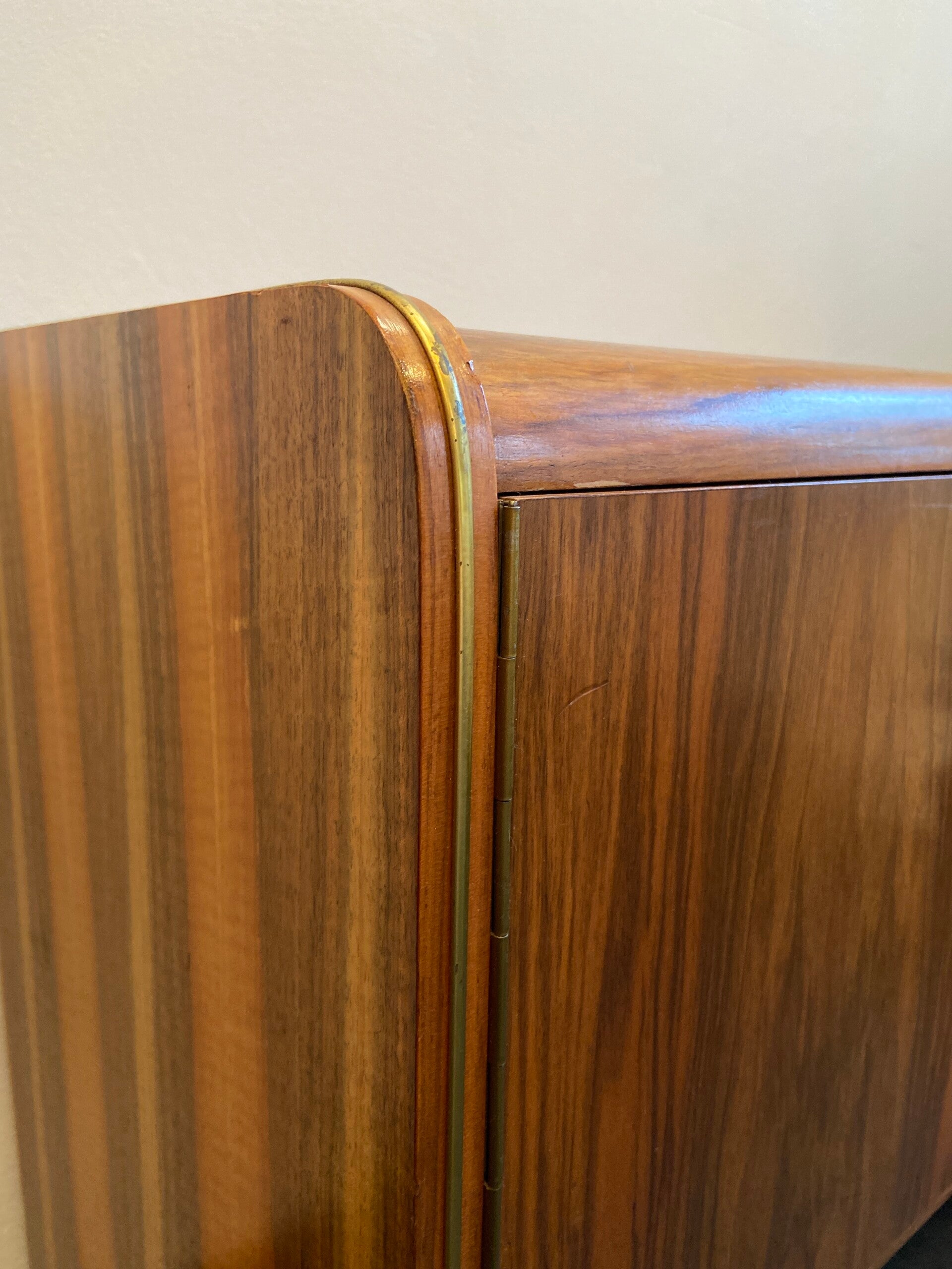 Wat een bijzonder exemplaar is deze mooie art deco halkast van notenhout (fineer) met een parapluhouder uit de jaren '30! De kast heeft links deur met open vak en rechts drie laden. Daarnaast beschikt de kast over een parapluhouder met een messing beugel. Let op de mooie houttekening en ronde vormen die kenmerkend zijn voor deze periode. De kast verkeert in een buitengewoon mooie vintage staat en heeft wat patina op de messing sierstrips aan weerskanten en er is aan de rechterkant op de bovenste rand een reparatie uitgevoerd, zoals te zien is op de laatste foto. Een eye-catcher die je niet vaak tegenkomt!