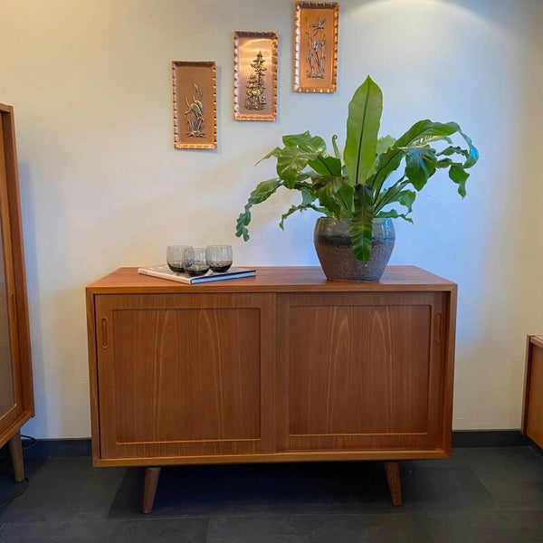 Een prachtkastje! Dit compacte teakhouten dressoir van P. Hundevad is afkomstig uit Denemarken en verkeert in topstaat! De kwaliteit en klasse straalt ervan af. Het hout heeft een warme uitstraling en erg mooie tekening. Achter de 2 schuifdeuren bevinden zich 2 planken van licht hout die veel opbergruimte bieden. Natuurlijk heeft de kast de kenmerkende sierlijke handgrepen waar het Deense design bekend om staat!