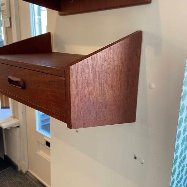 Prachtig zwevend kastje met lade uit Denemarken. Het kastje heeft een royaal formaat zodat het voldoende ruimte heeft voor het opbergen van kleine spullen. Leuk als nachtkastje of als halkastje met een spiegel erboven! Het kastje verkeert in een zeer goede staat; zoals op de foto's is te zien en heeft een mooi gevormde handgreep.