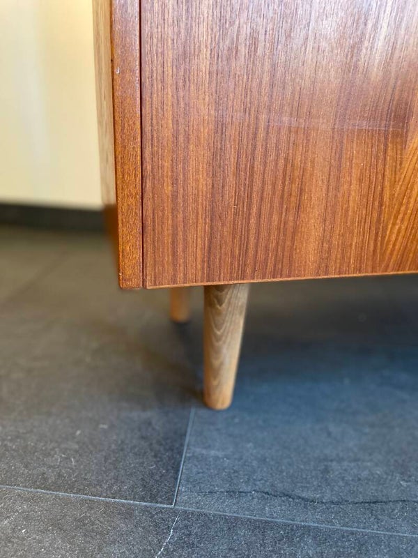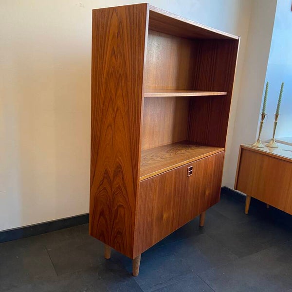 Zeer mooie boeken-/wandkast met klep, uitgevoerd in warm teakfineer. De kast heeft een verstelbare plank en achter de klep links een vak met vakverdeling en rechts een open vak. Het rechter vak is in het verleden vermoedelijk gebruikt als drankenkast; hier zijn wat oppervlakkige kringen zichtbaar. Let op de mooie houttekening en het typisch Deense handgreepje, dat de kast nét nog wat extra uitstraling geeft! De kast verkeert in bijzonder mooie staat en heeft minimale gebruikssporen in de vorm van wat oppervlakkige krasjes op het bovenblad; zie hiervoor de foto's die onderdeel vormen van de beschrijving. Het gaat om kleine gebruikssporen, maar goed om te weten.