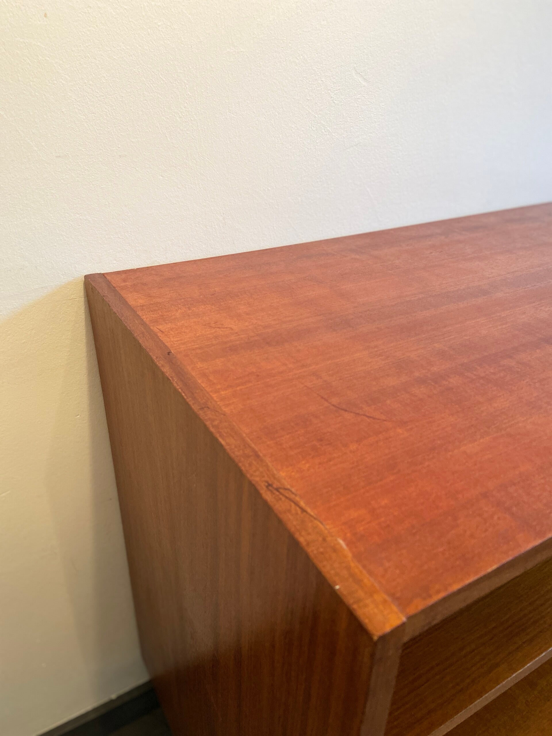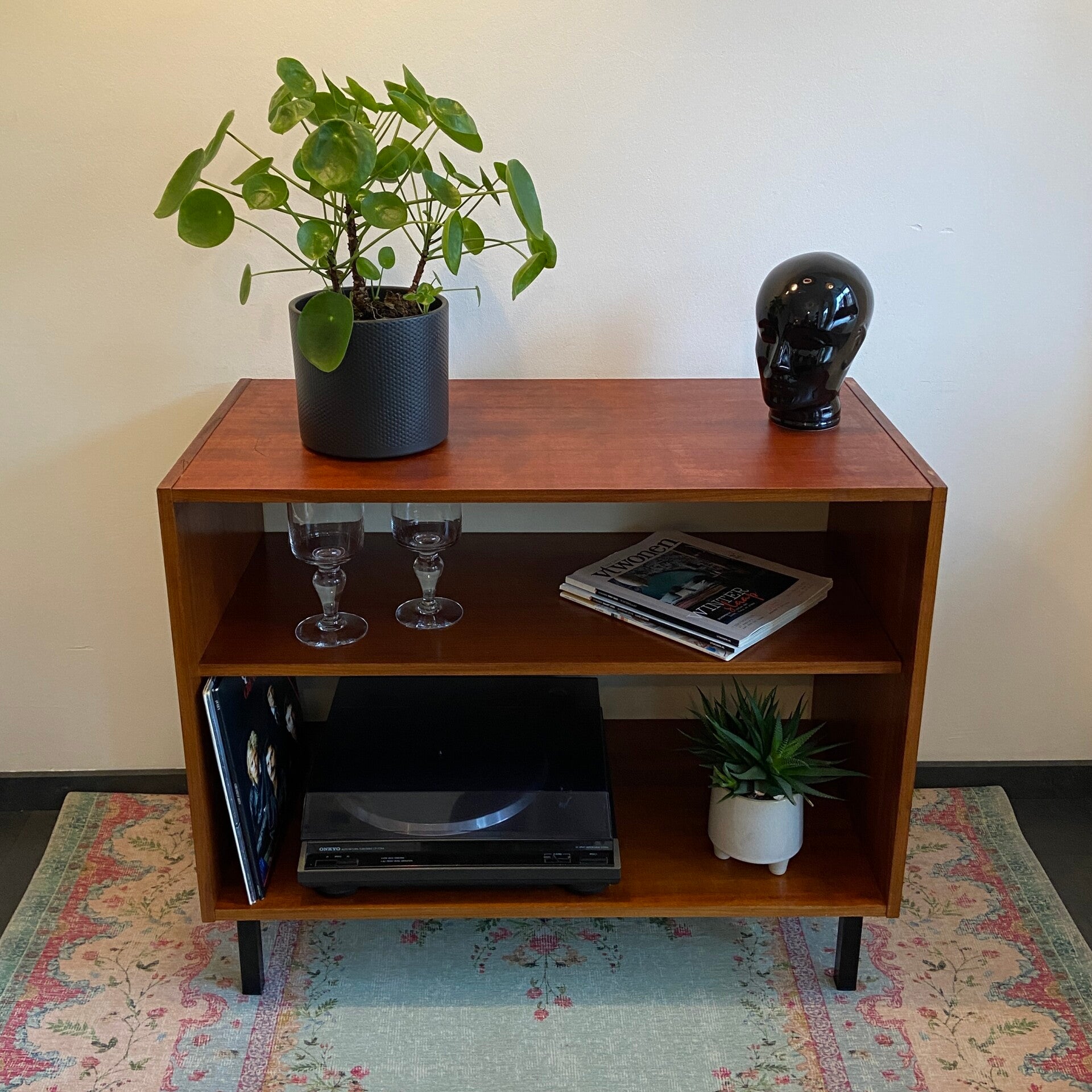 Stoere Finse kast van een zware kwaliteit teakfineer met zwart metalen poten. De combinatie van het warme hout en de zwarte poten geven de kast een eigentijdse uitstraling. De kast biedt voldoende ruimte voor boeken, platen, platenspeler en tv! In de acherwand linksonder zijn 3 gaten aangebracht voor het doorvoeren van snoeren; zoals op de foto's te zien is, is dit netjes gedaan. Ideaal dus voor je platenspeler, printer of andere apparatuur. De kast verkeert in een zeer mooie vintage staat en heeft slechts wat oppervlakkige krasjes op de bovenkant; zie hiervoor de foto's die onderdeel zijn van de beschrijving.