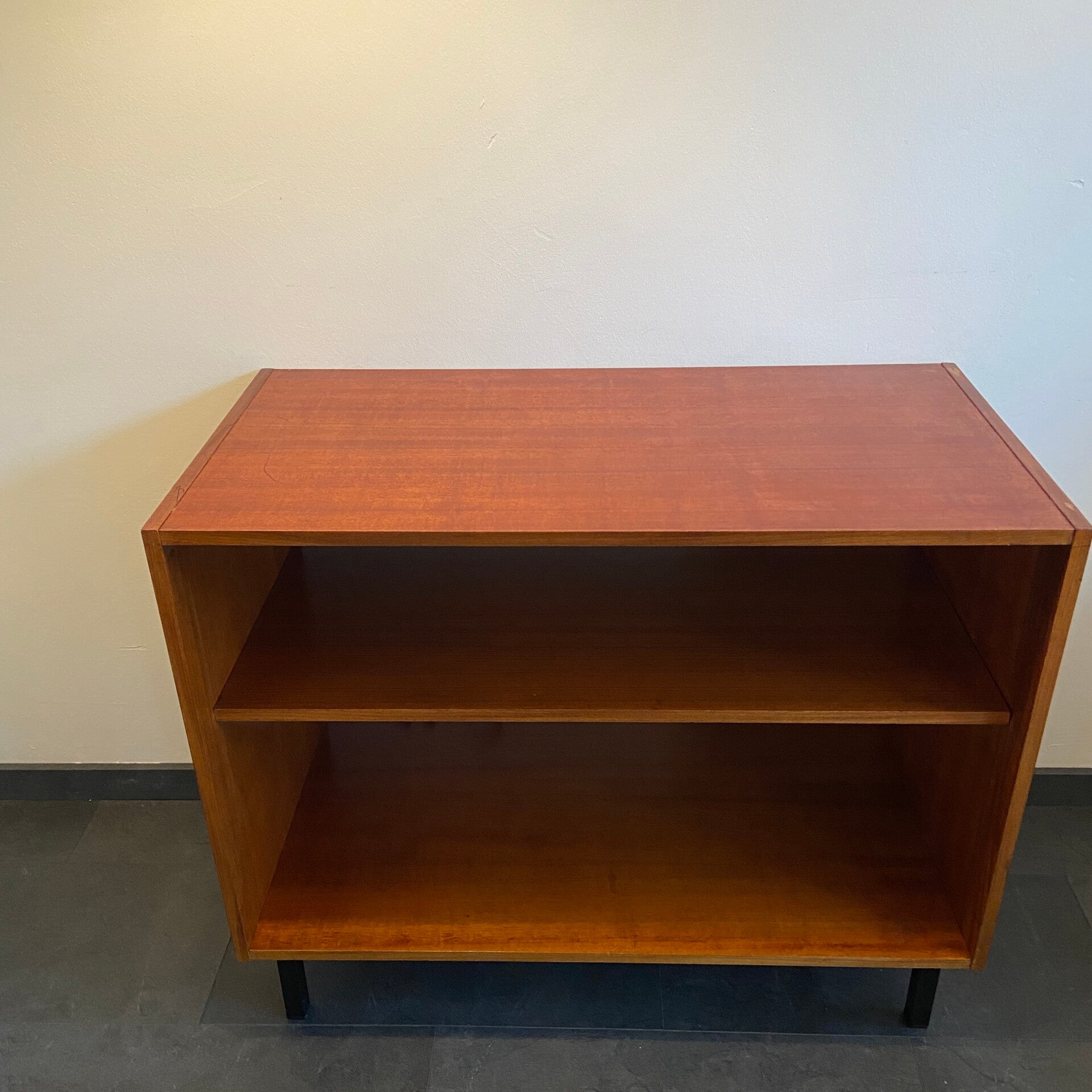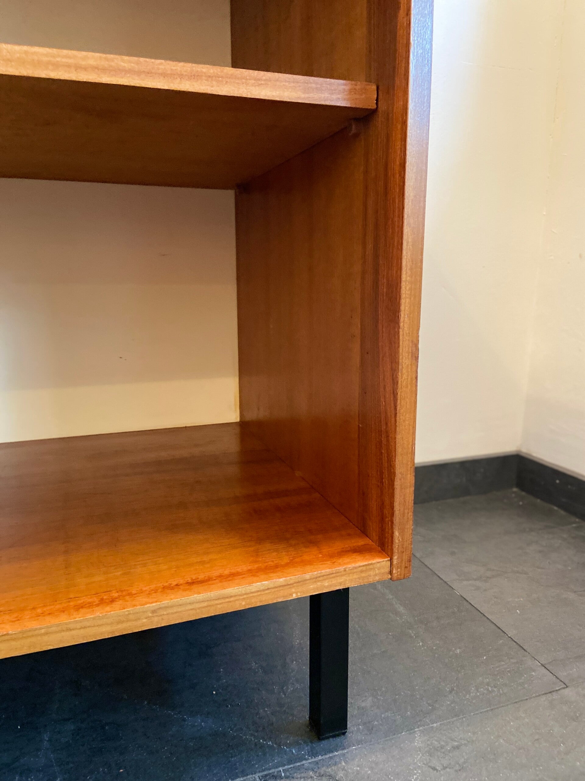 Platenkast/boekenkast van teakfineer op zwarte metalen poten