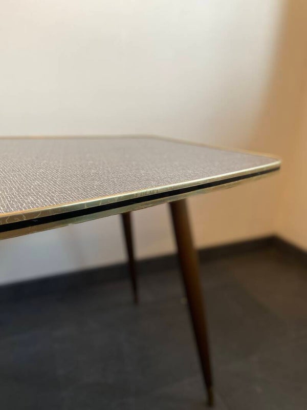 Geweldige koffietafel met een blad in niervorm van grijs/wit/zwart formica! De tafel dateert uit de jaren 60 maar verkeert in uitzonderlijk goede staat; zoals te zien is op de foto's. De tafel staat op hoge, taps toelopende poten die eraf kunnen voor vervoer. Het tafelblad heeft een messingkleurige band met een zwarte rand. Op de band zijn lichte sporen van gebruik zichtbaar. Het blad heeft geen vlekken of kringen, hier en daar een ruw plekje maar dat is alleen voelbaar.