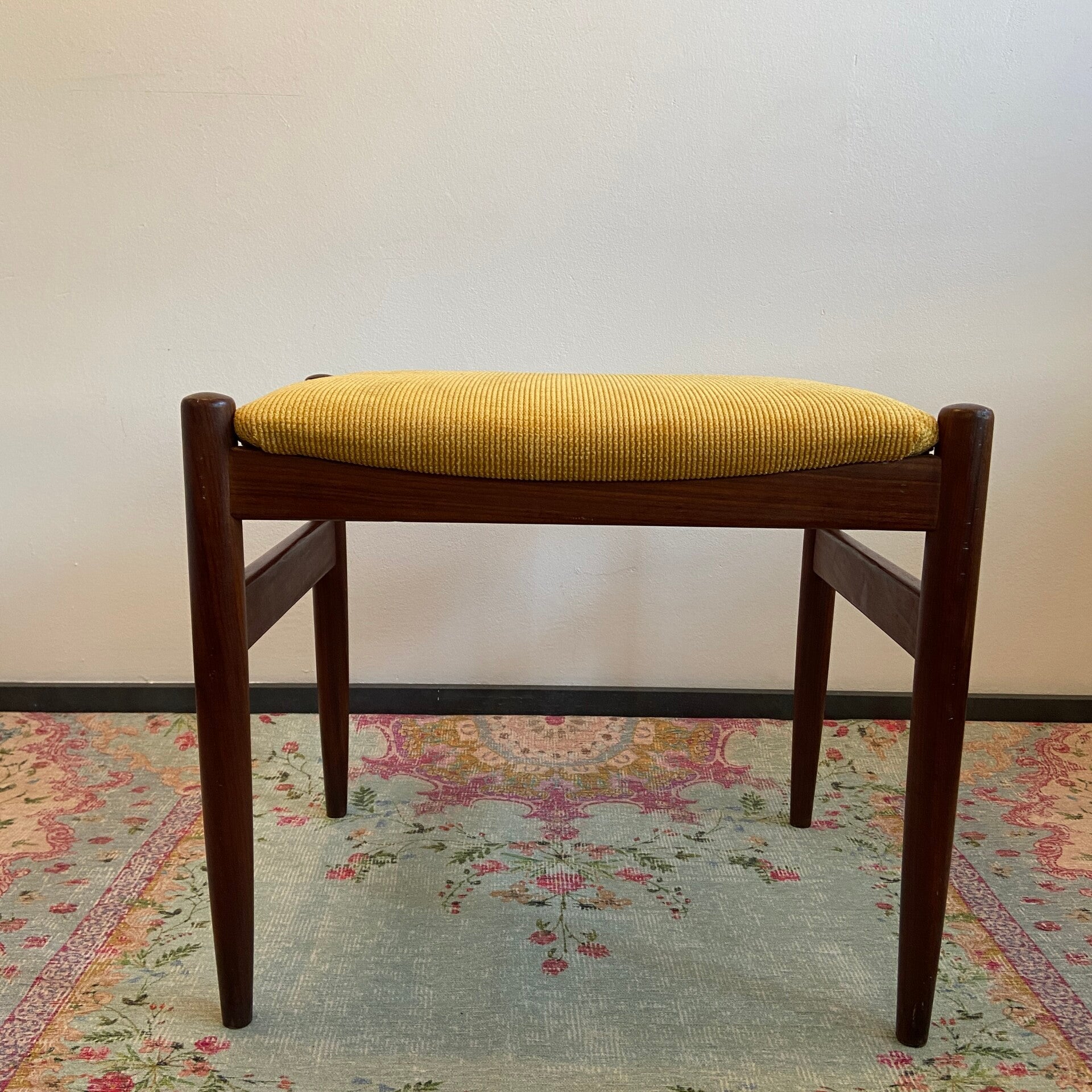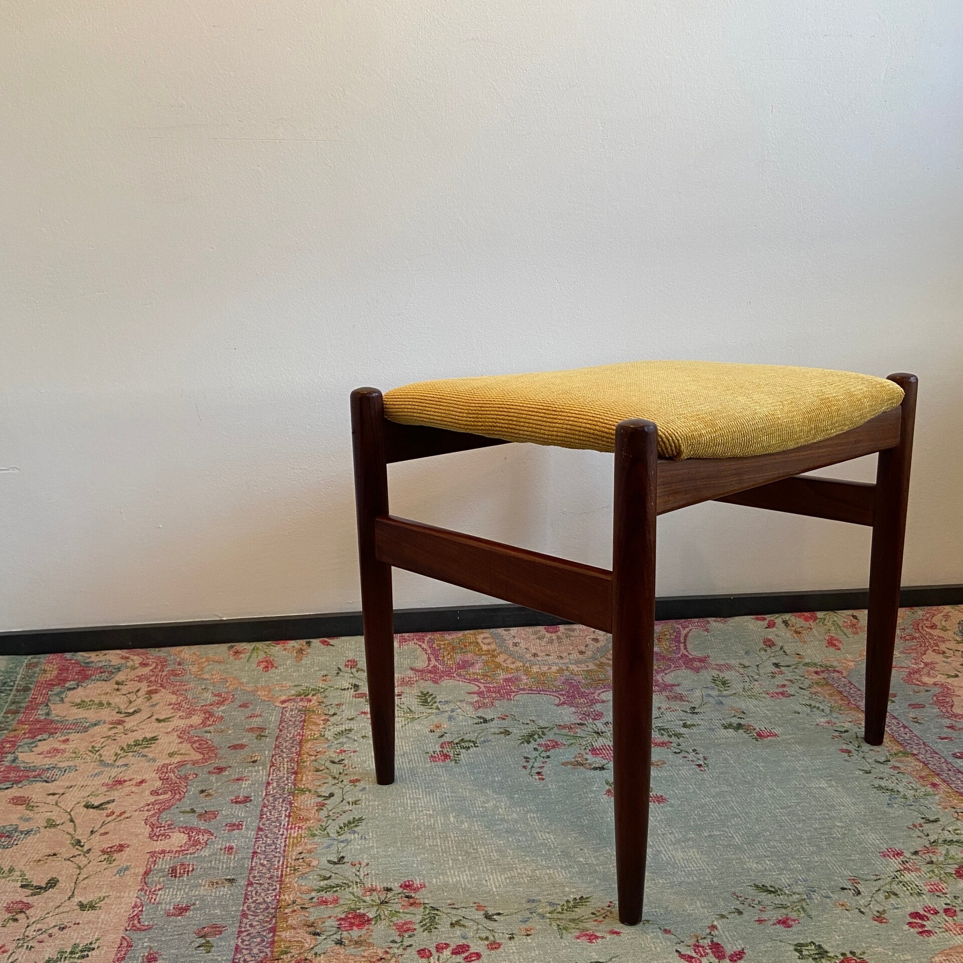 Prachtig vormgegeven voetenbankje van Nils O. Møller, uitgevoerd in teakhout met een zonnige nieuwe bekleding in gele ribstof.