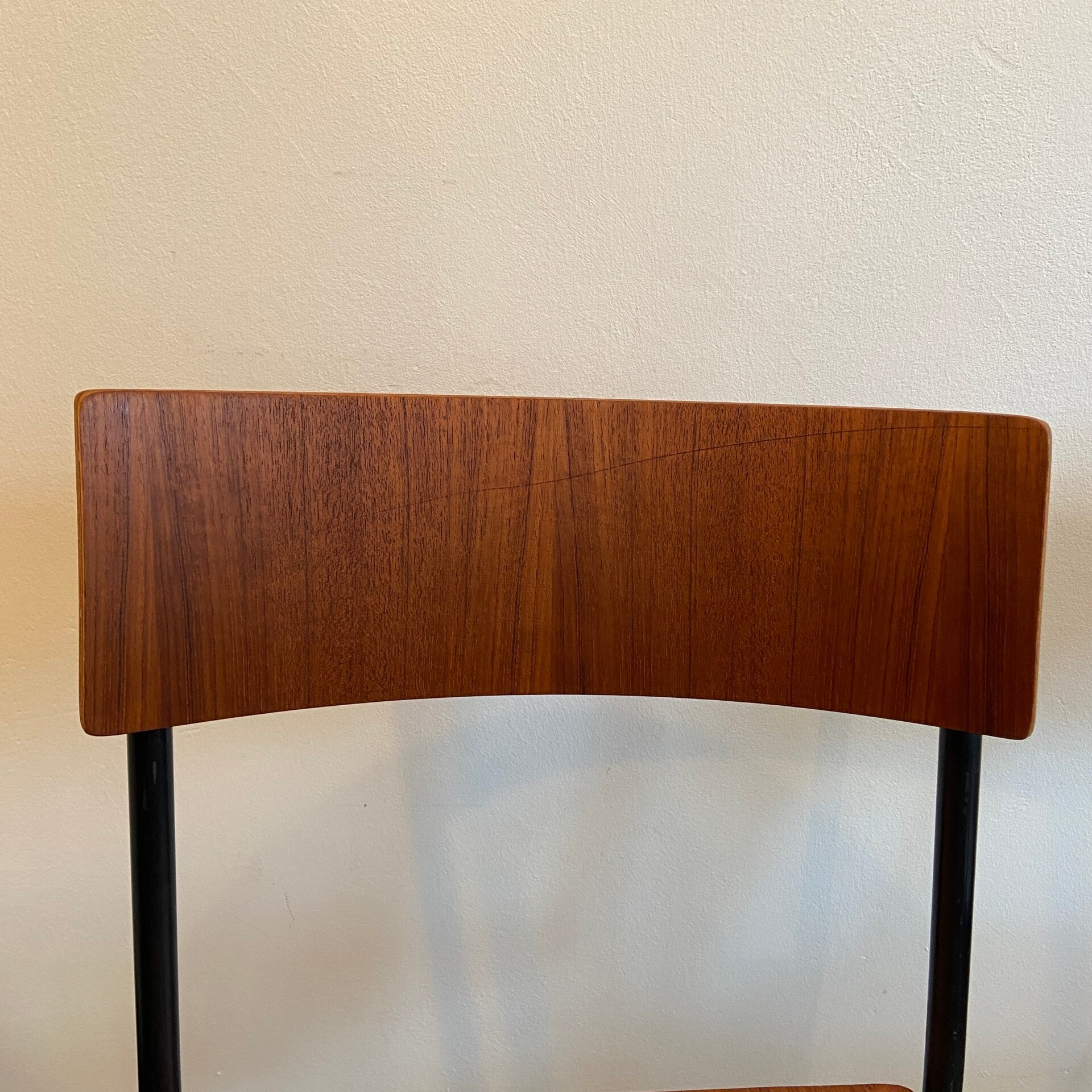 Set van 2 vintage schoolstoelen met een plywood zitting en rugleuning in warm teak en een frame van zwart metaal. De stoelen verkeren in zeer mooie vintage staat; zoals op de foto's is te zien. Een van de stoelen heeft een wat donkerdere streep in het hout op de rugleuning. De stoelen zijn eventueel ook per stuk te koop voor €119,- p.st.