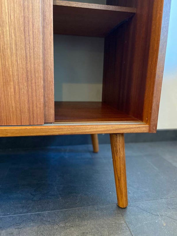 Praktisch compact dressoir/wandkast met 2 schuifdeuren en verstelbare plank. De kast is uitgevoerd in teakfineer met een mooie houttekening en verkeert in goede vintage staat; rechts onderaan is een fineerschade bijgewerkt. Zie ook de foto's die onderdeel zijn van de beschrijving. Na een paar aanpassingen is deze kast ook goed toe te passen als wastafelmeubel! De kast is afkomstig uit Zweden.