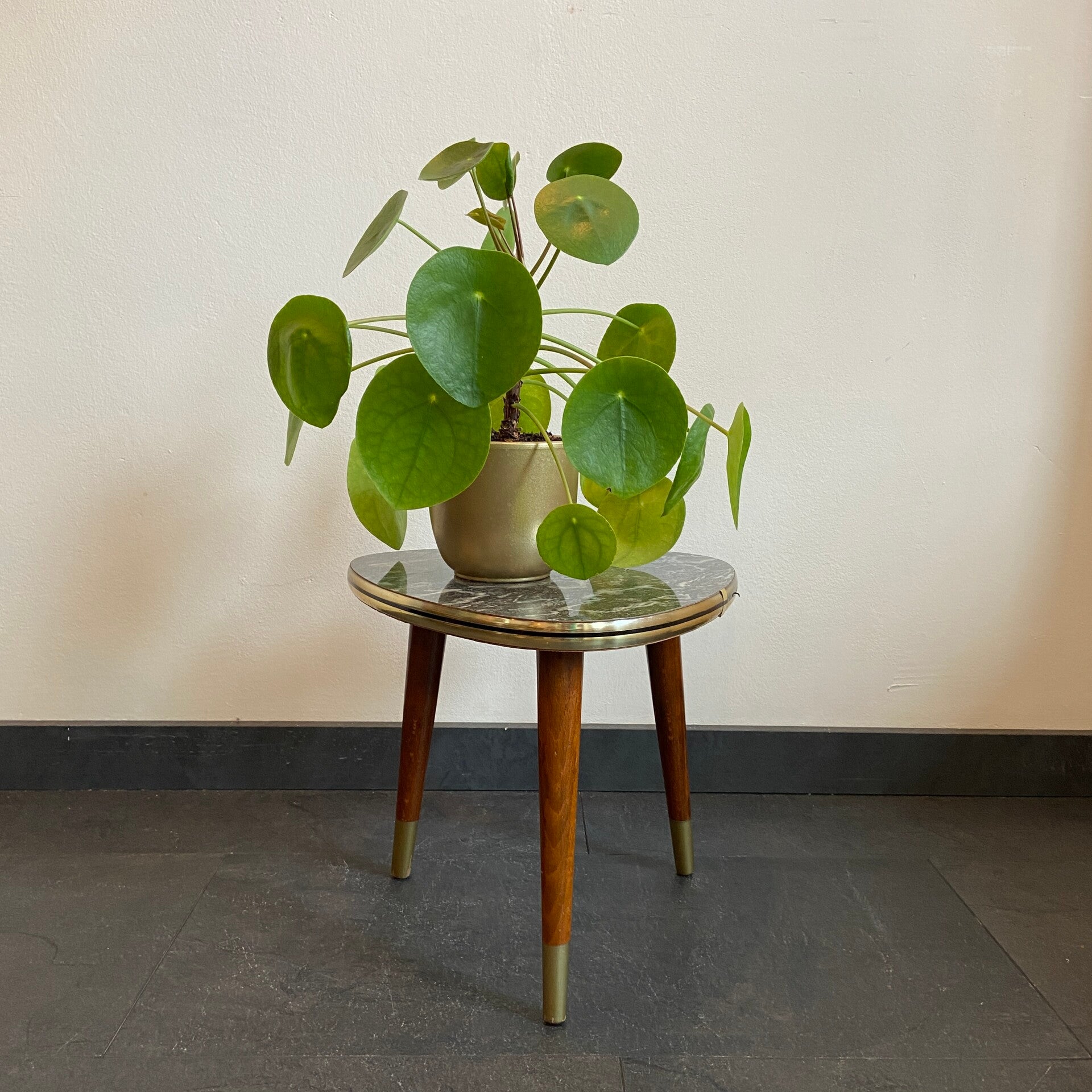 Plantentafel in mooie staat met een blad van grijs gemarmerd vinyl met messing rand en zwarte band. De rand is netjes afgewerkt met het originele afdekstripje, dat vaak ontbreekt bij deze oude tafeltjes. De poten hebben goudkleurige sokjes en kunnen er niet af voor vervoer!