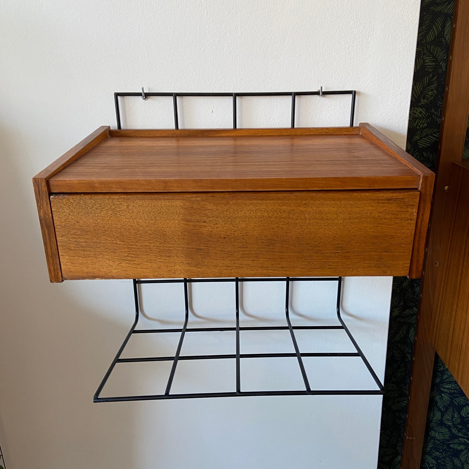 - Een zwevend halkastje met lade en zwart metalen lectuurrek. Bevestigingshaken zijn bijgevoegd. B38 x H35 x D27 cm.